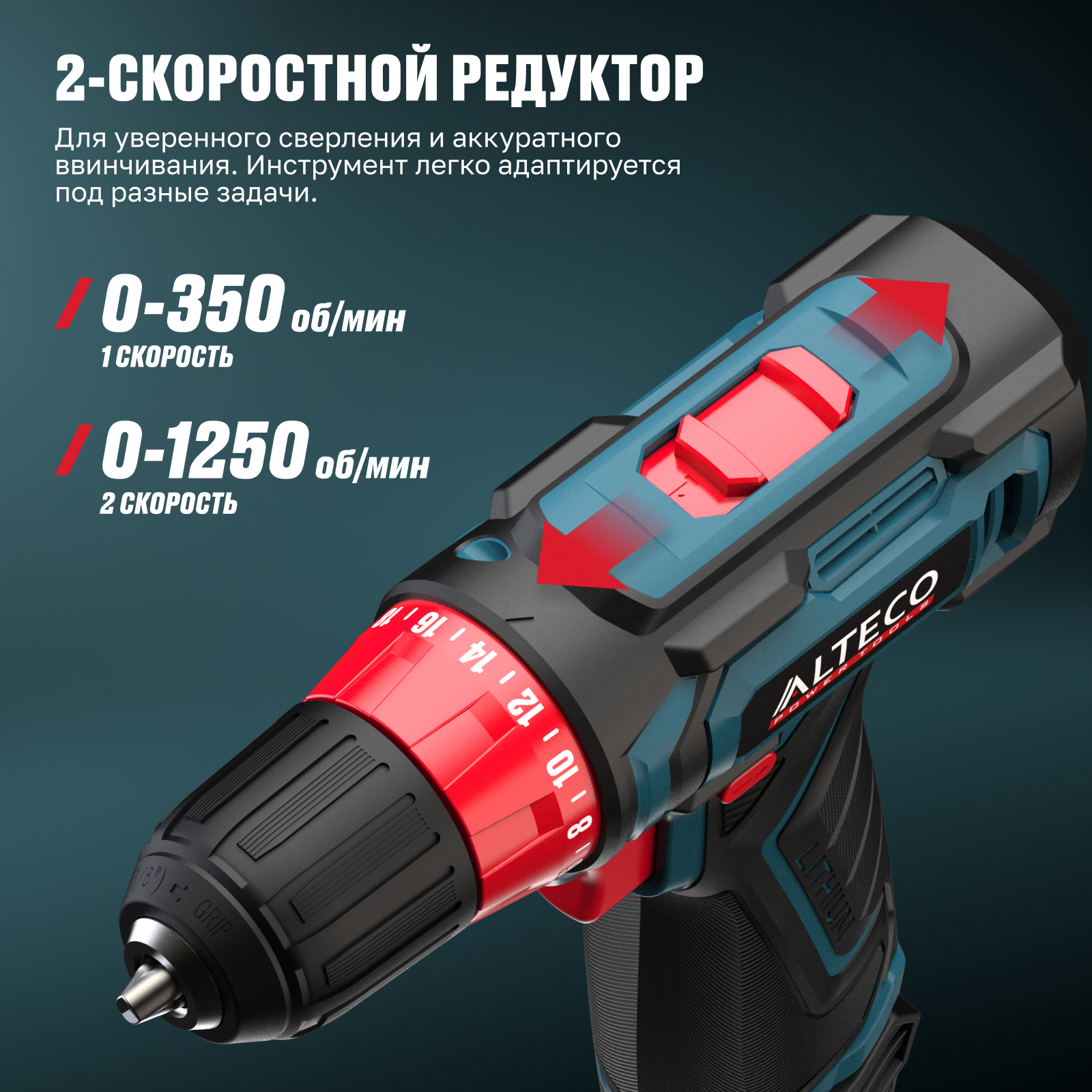 - 2 скорости — для уверенного сверления и аккуратного ввинчивания. Инструмент легко адаптируется под разные задачи.