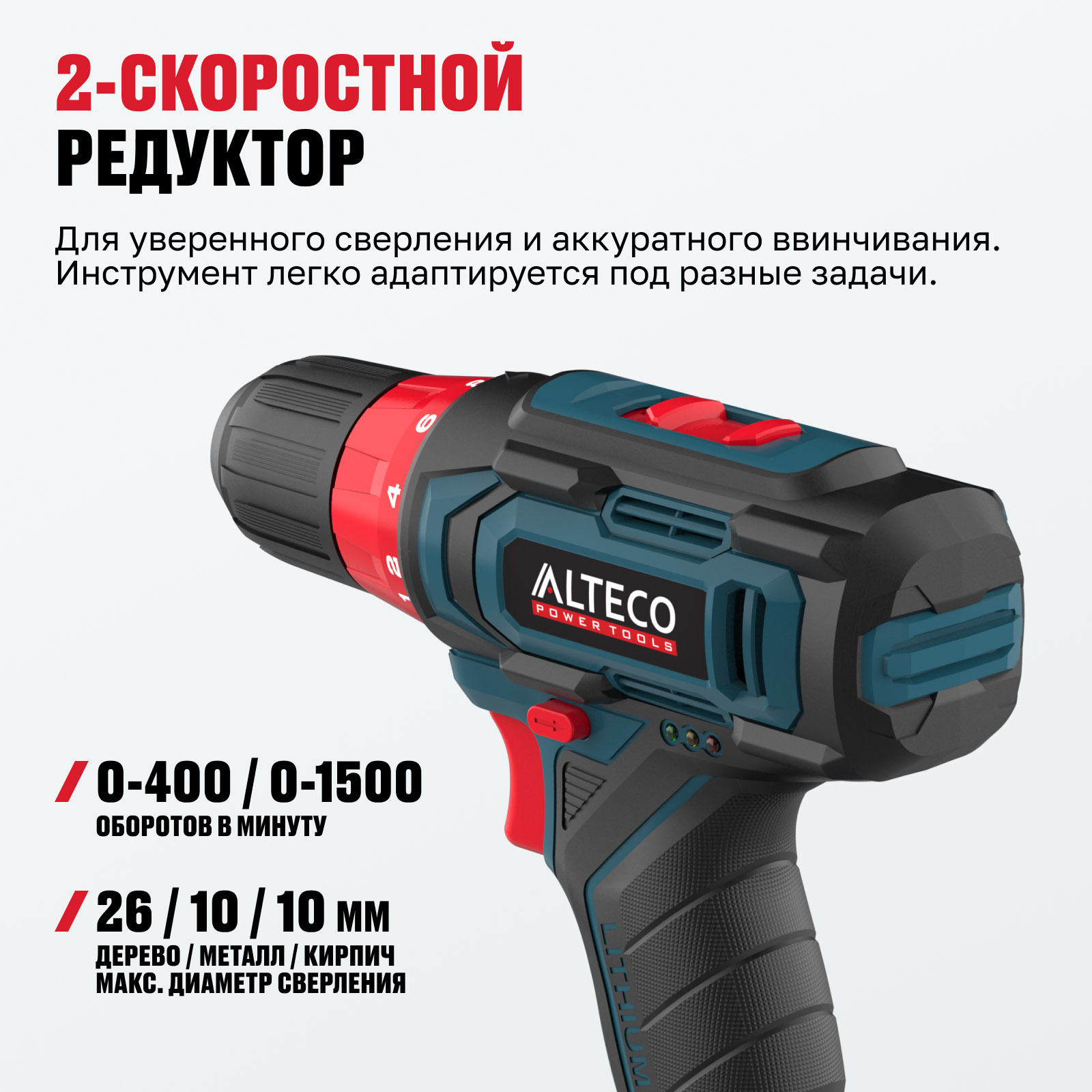 - 2 скорости — для уверенного сверления и аккуратного ввинчивания. Инструмент легко адаптируется под разные задачи.