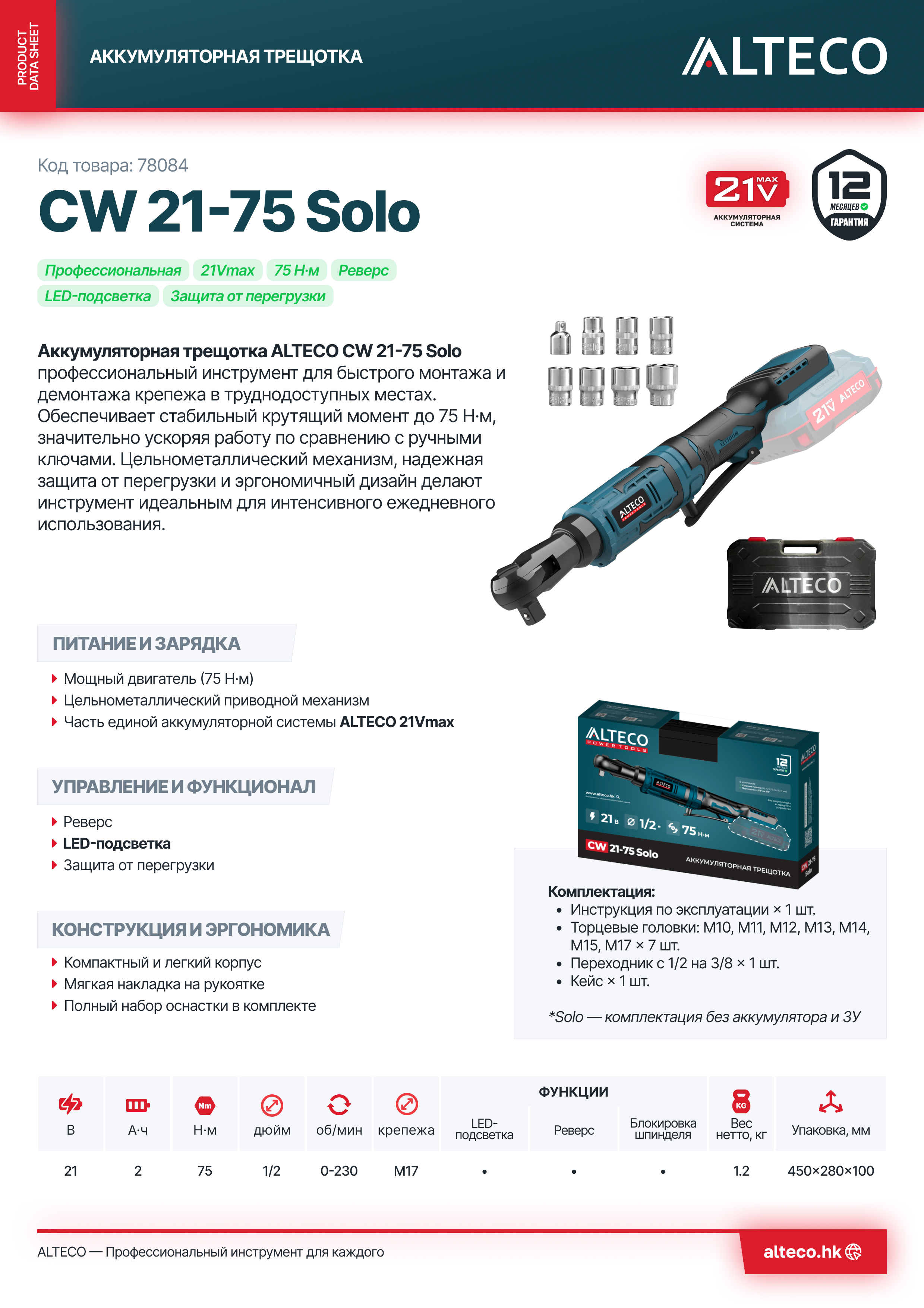 - Часть единой аккумуляторной системы ALTECO 21Vmax — один аккумулятор подходит для всех инструментов этой серии, обеспечивая удобство, экономию и гибкость в работе.
