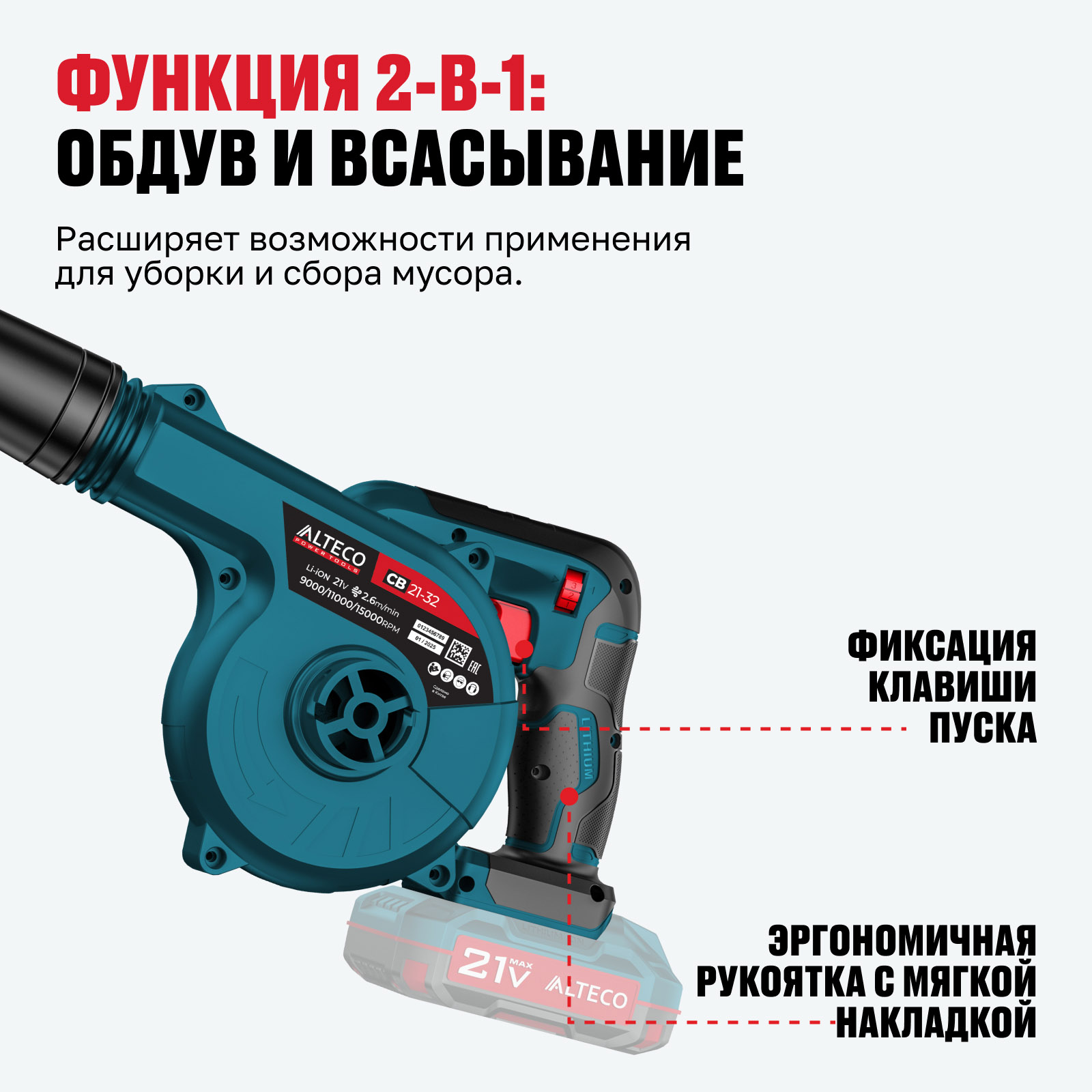 - Функция 2-в-1: обдув и всасывание — расширяет возможности применения для уборки и сбора мусора.