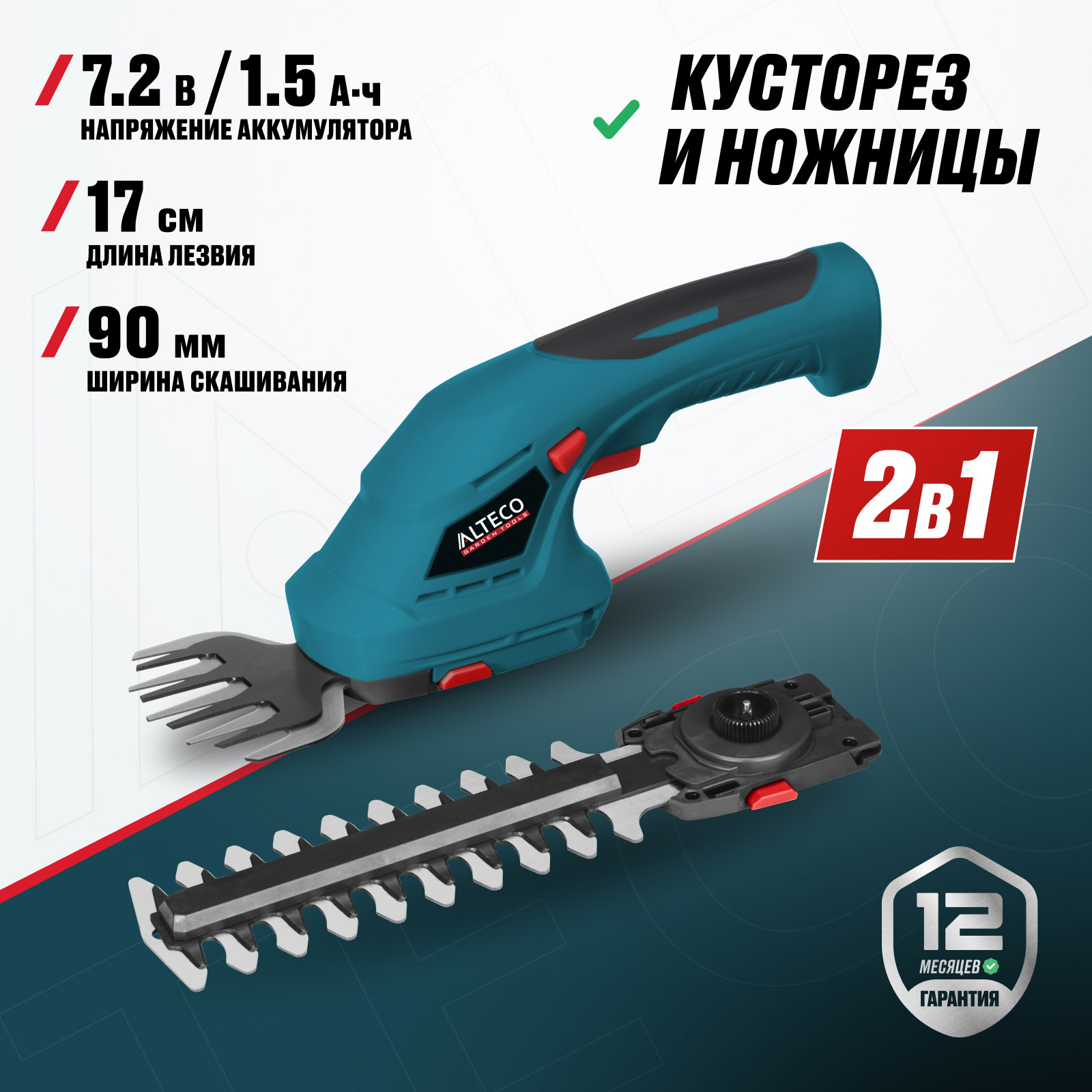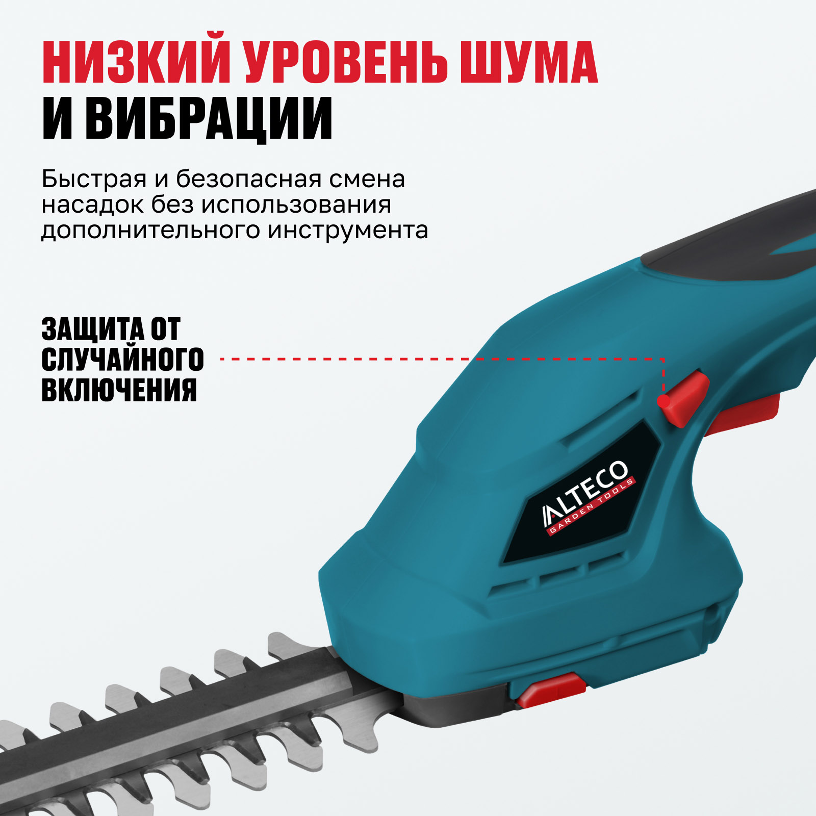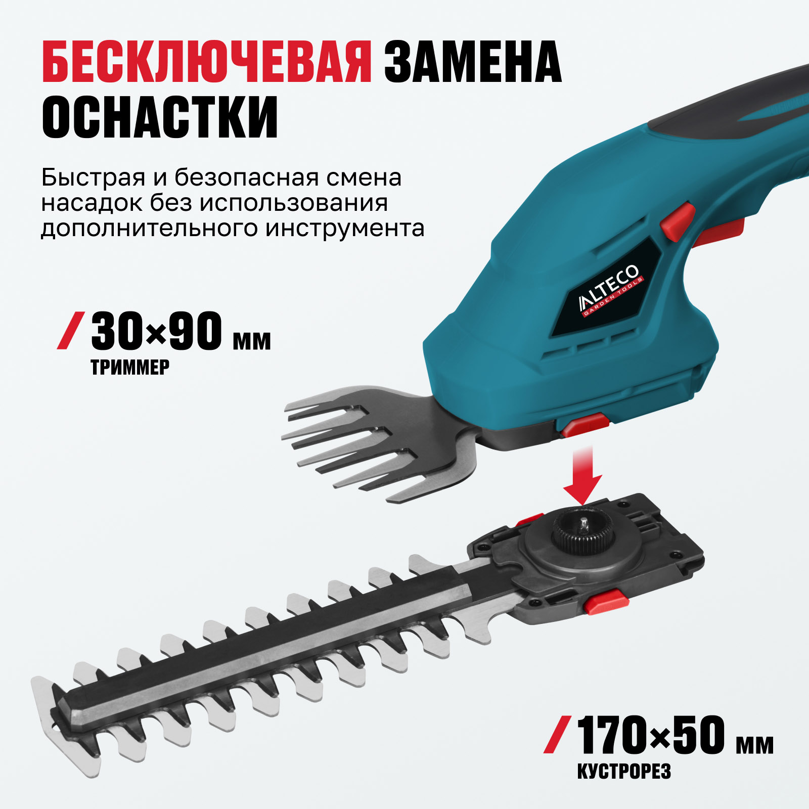 - Функция 2в1: кусторез и ножницы — быстрая смена насадок позволяет подстригать кустарники и ухаживать за газоном одним инструментом.