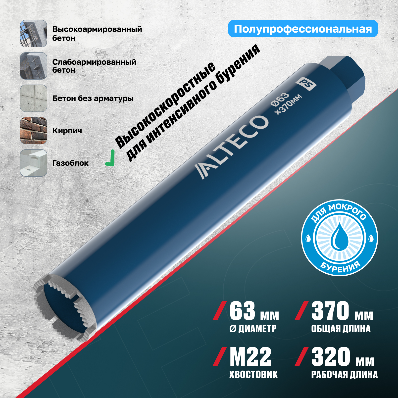 ⚠️ Важно: Данная коронка не предназначена для сухого бурения. Используйте охлаждение водой для продления срока службы инструмента и коронки. Не предназначена для работы с инструментом с микроударом.