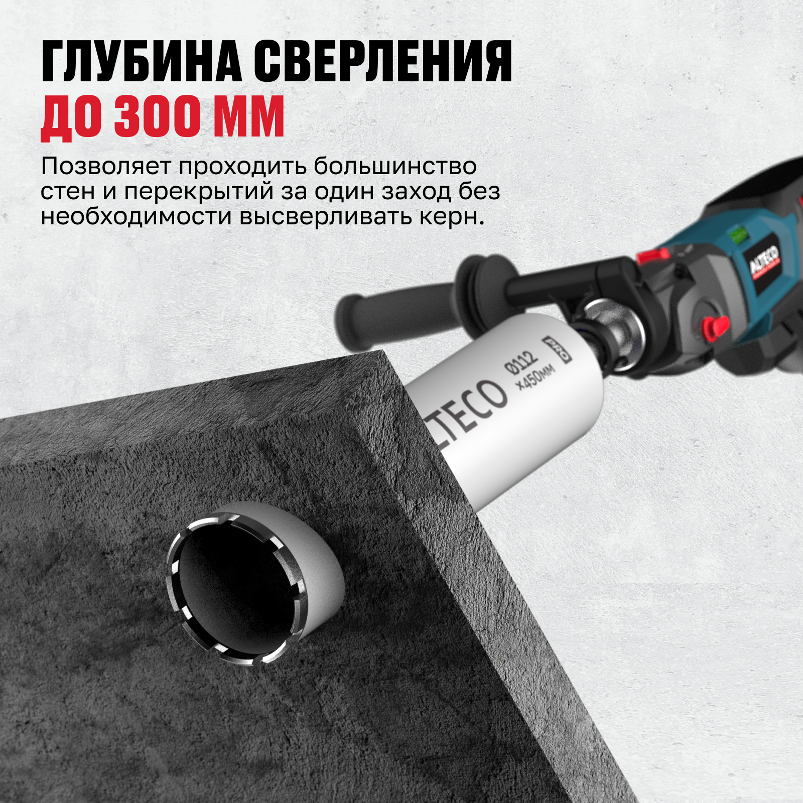 - Глубина сверления до 400 мм — позволяет проходить большинство стен и перекрытий за один заход без необходимости высверливать керн.