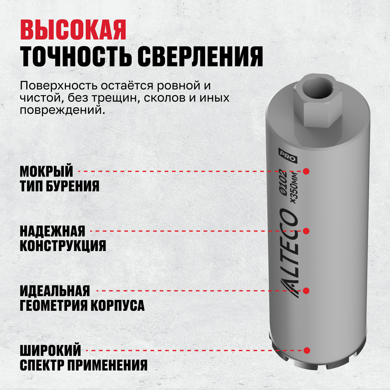 - Высокая точность сверления — поверхность остаётся ровной и чистой, без трещин, сколов и иных повреждений.