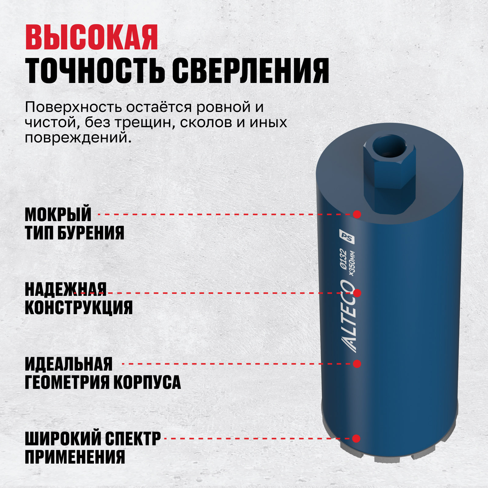 - Высокая точность сверления — поверхность остаётся ровной и чистой, без трещин, сколов и иных повреждений.