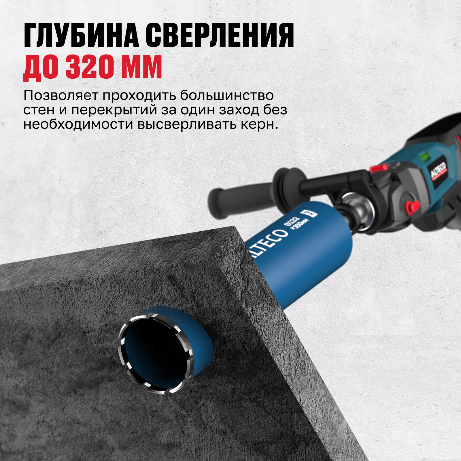 - Глубина сверления до 320 мм — позволяет проходить большинство стен и перекрытий за один заход без необходимости высверливать керн.