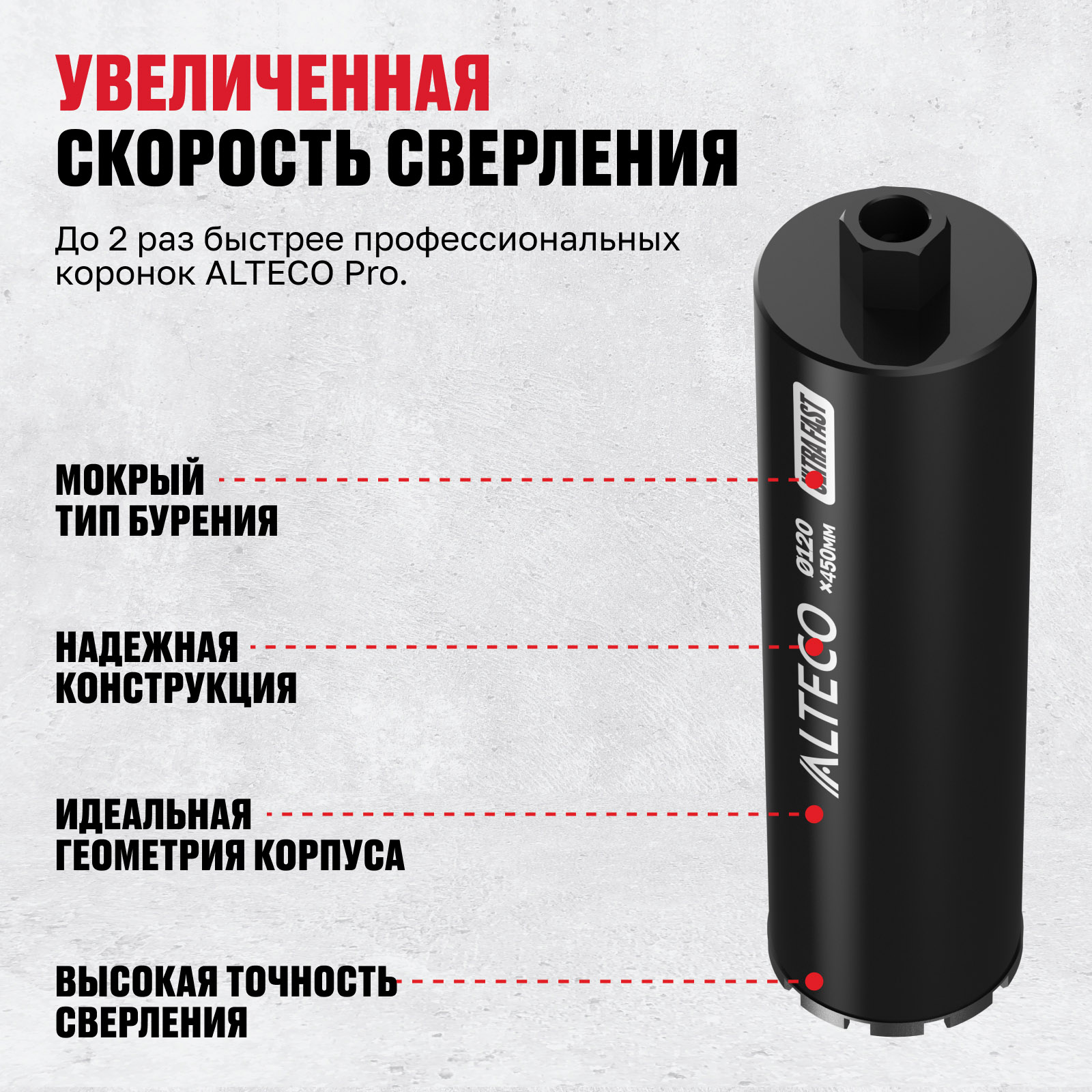 - Увеличенная скорость сверления — до 2 раз быстрее профессиональных коронок ALTECO Pro.