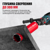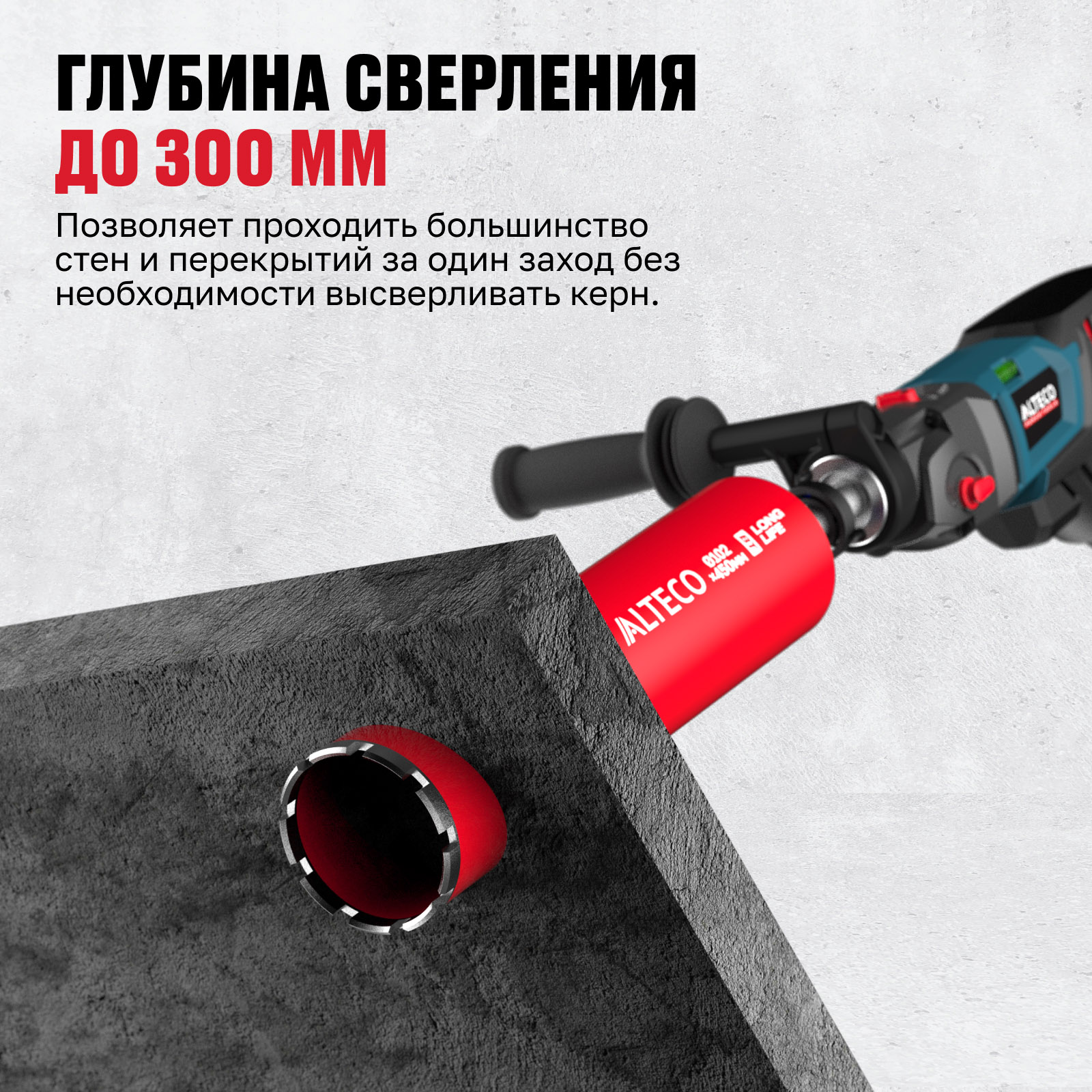 - Глубина сверления до 300 мм — позволяет проходить большинство стен и перекрытий за один заход без необходимости высверливать керн.