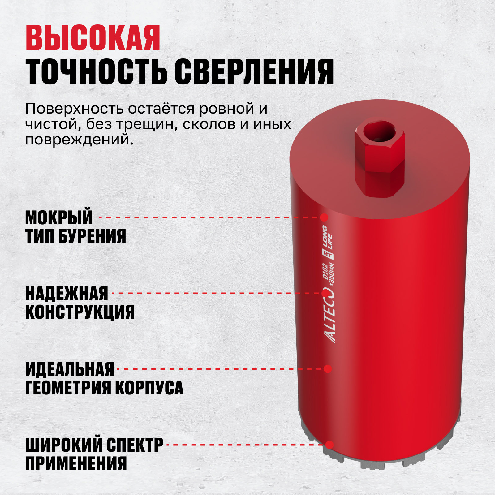 - Мокрый тип бурения — предотвращает перегрев и продлевает срок службы коронки.