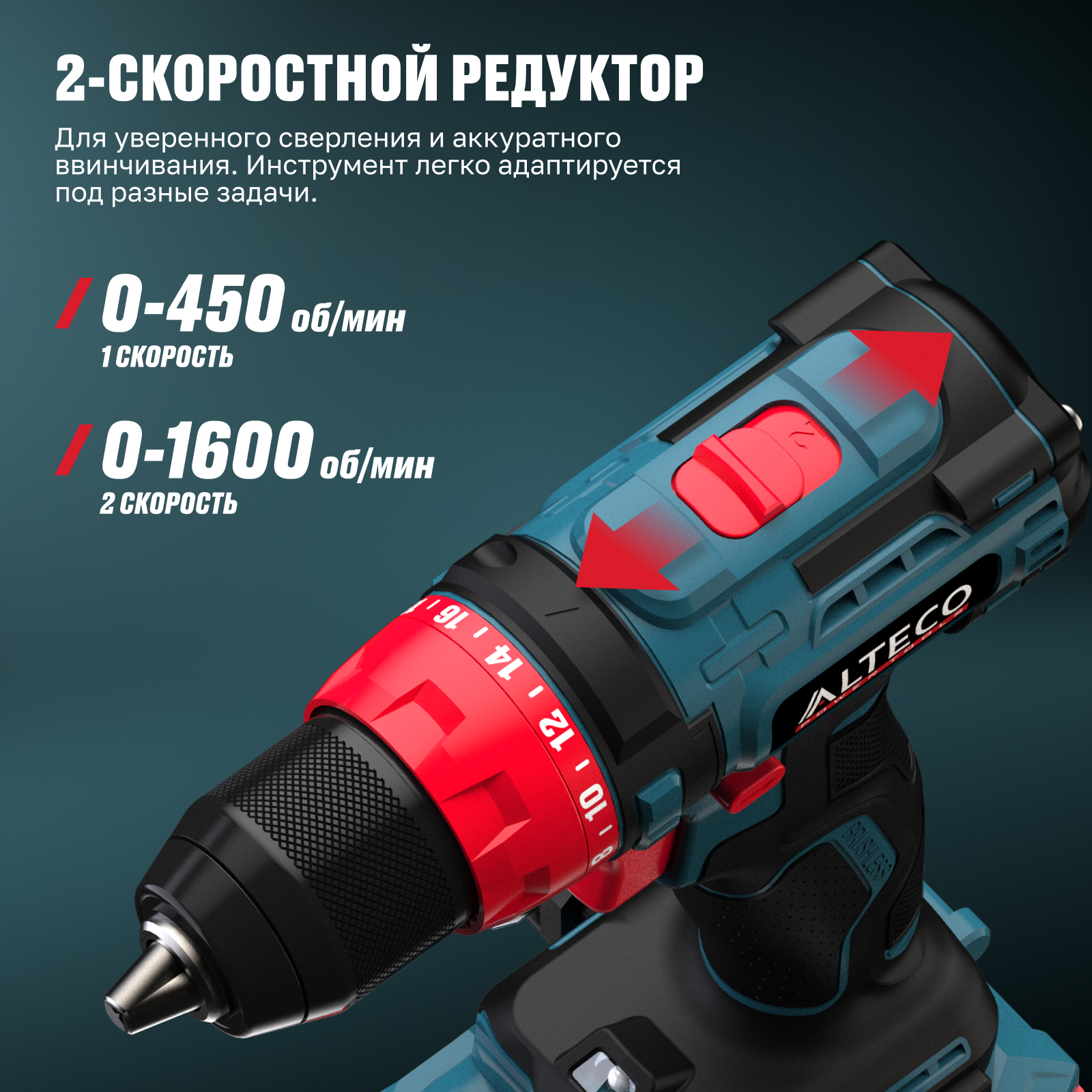 - 2 скорости — для уверенного сверления и аккуратного ввинчивания. Инструмент легко адаптируется под разные задачи.