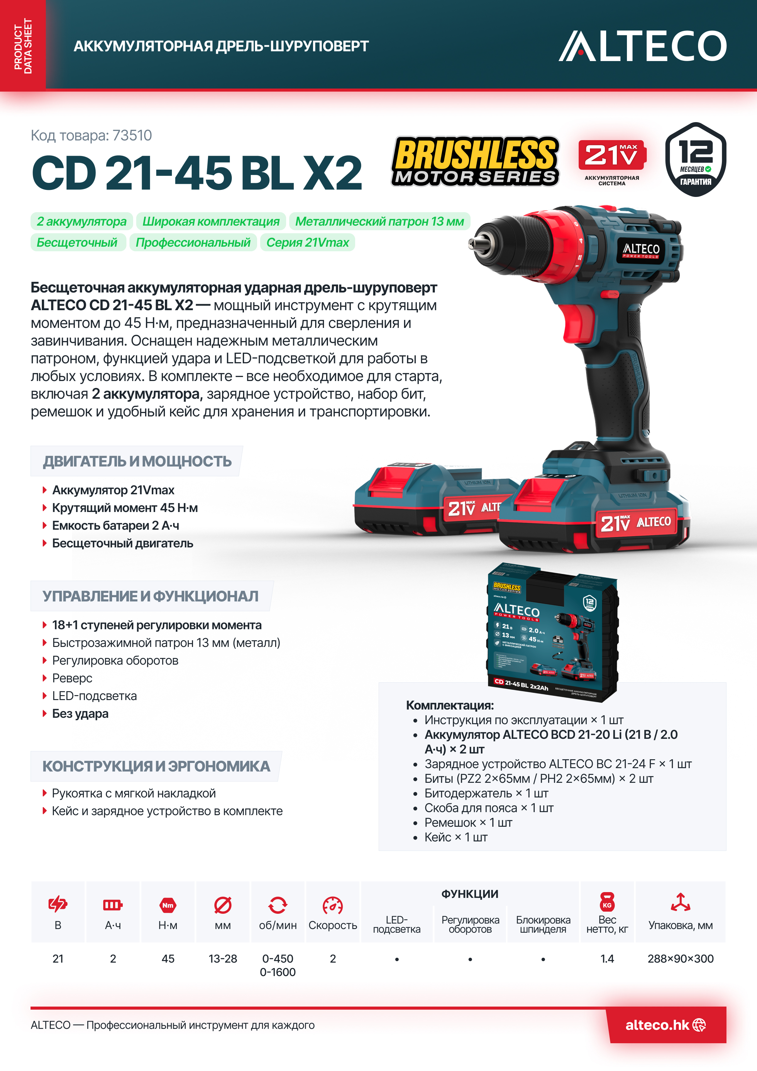- Часть единой аккумуляторной системы ALTECO 21Vmax — один аккумулятор подходит для всех инструментов этой серии, обеспечивая удобство, экономию и гибкость в работе.