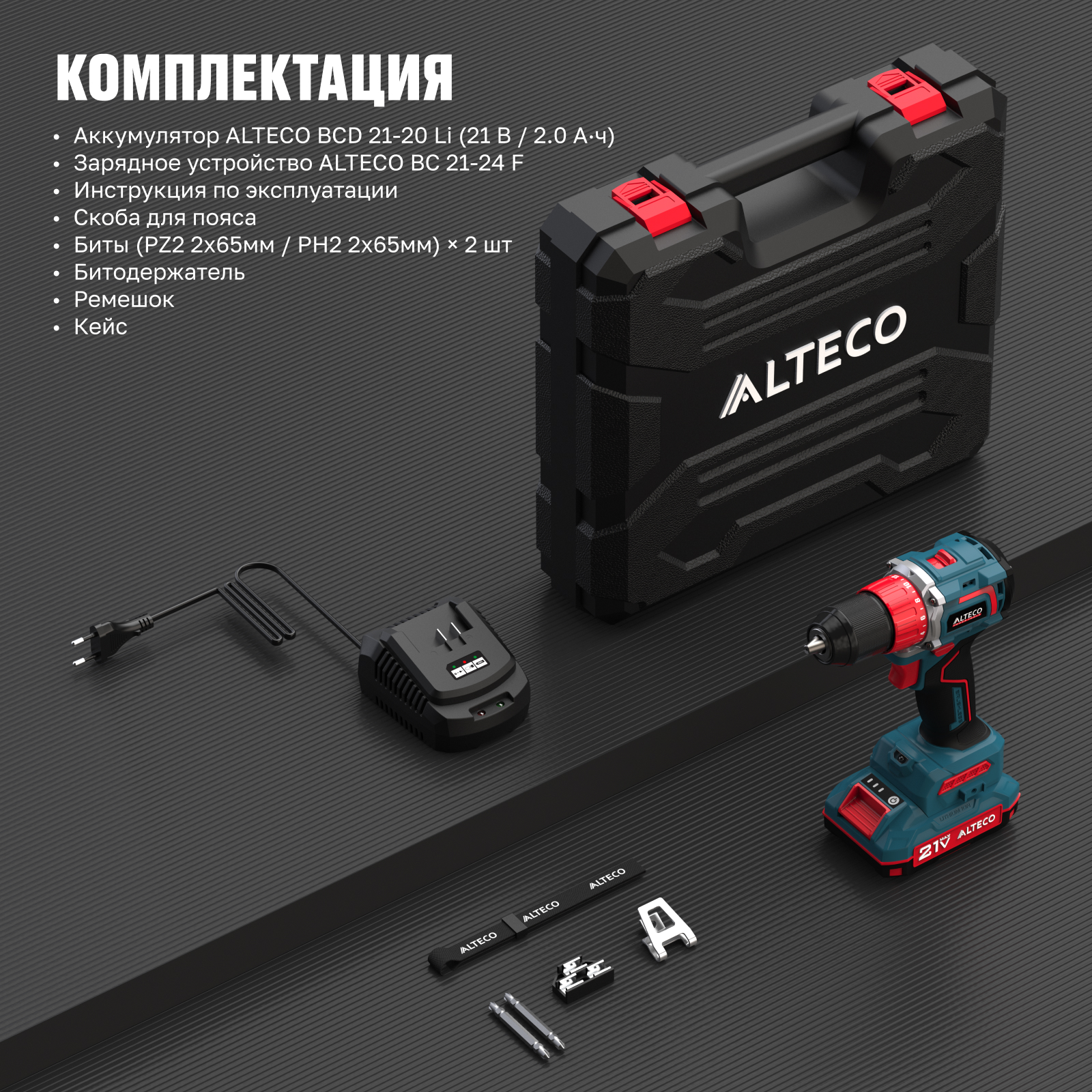 - Аккумулятор ALTECO BCD 21-20 Li (21 В / 2.0 А·ч) × 1 шт