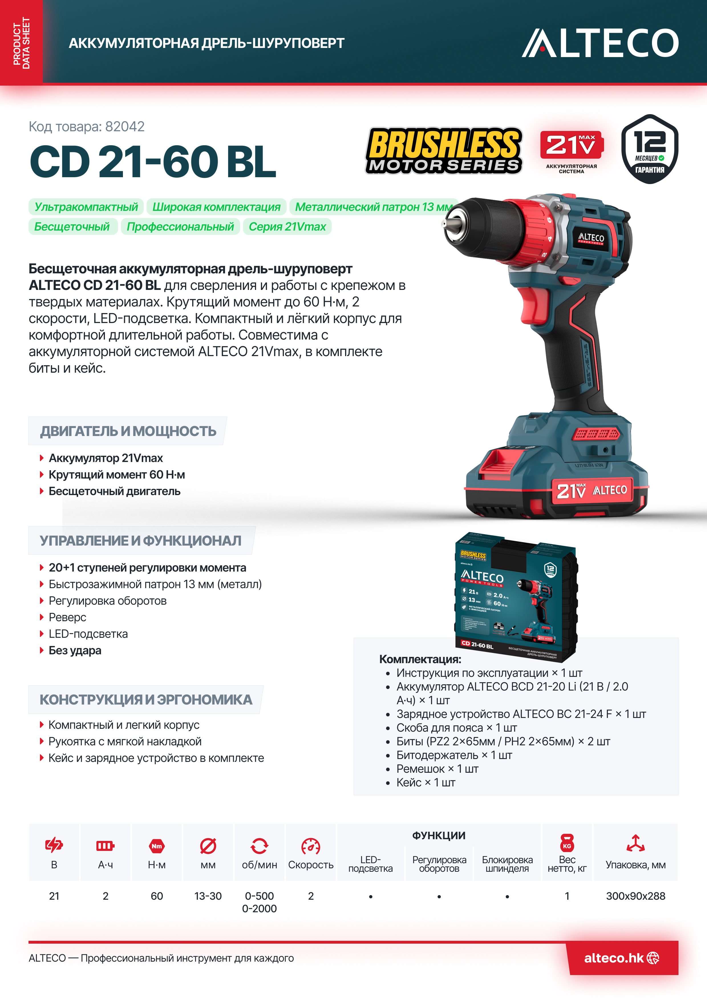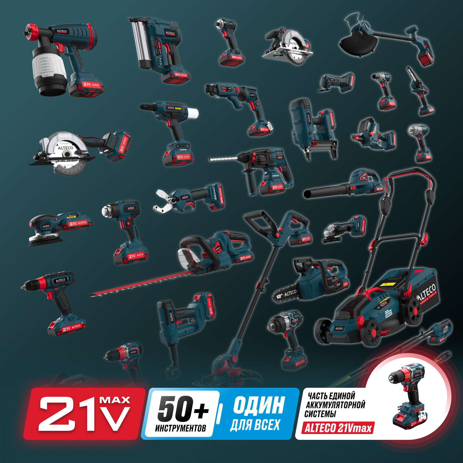 - Часть единой аккумуляторной системы ALTECO 21Vmax — один аккумулятор подходит для всех инструментов этой серии, обеспечивая удобство, экономию и гибкость в работе.