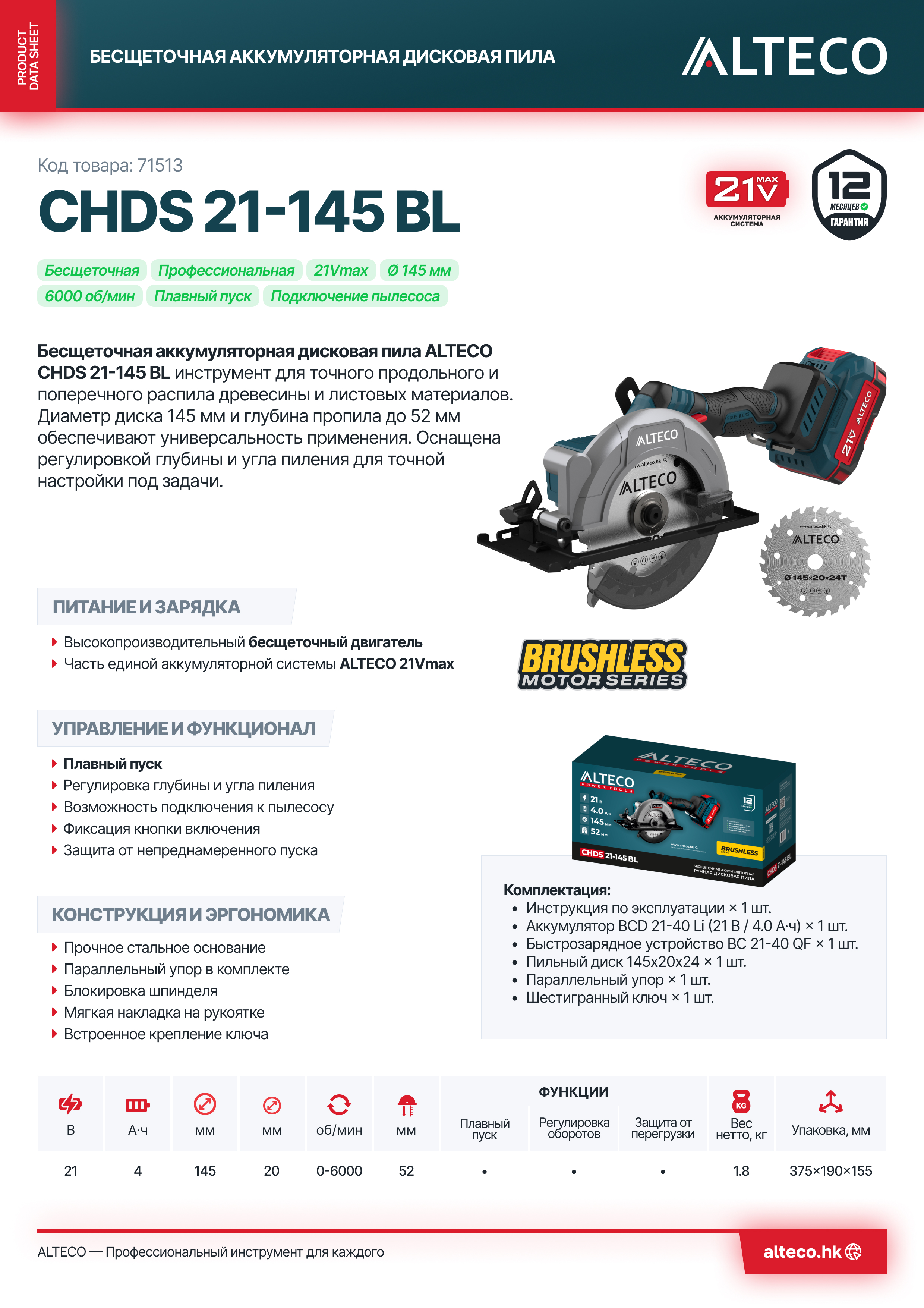 - Часть единой аккумуляторной системы ALTECO 21Vmax — один аккумулятор подходит для всех инструментов этой серии, обеспечивая удобство, экономию и гибкость в работе.