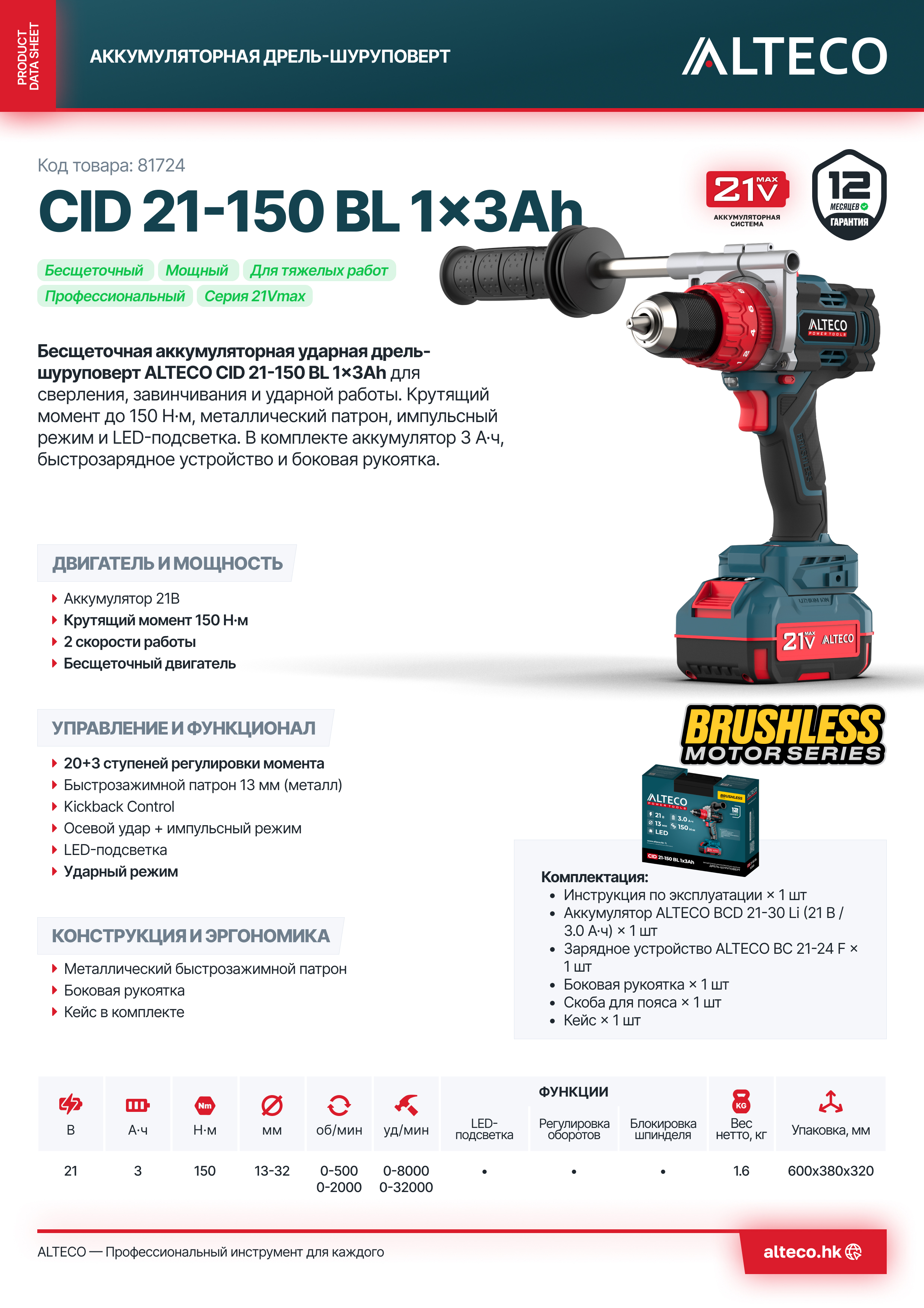 - Часть единой аккумуляторной системы ALTECO 21Vmax — один аккумулятор подходит для всех инструментов этой серии, обеспечивая удобство, экономию и гибкость в работе.