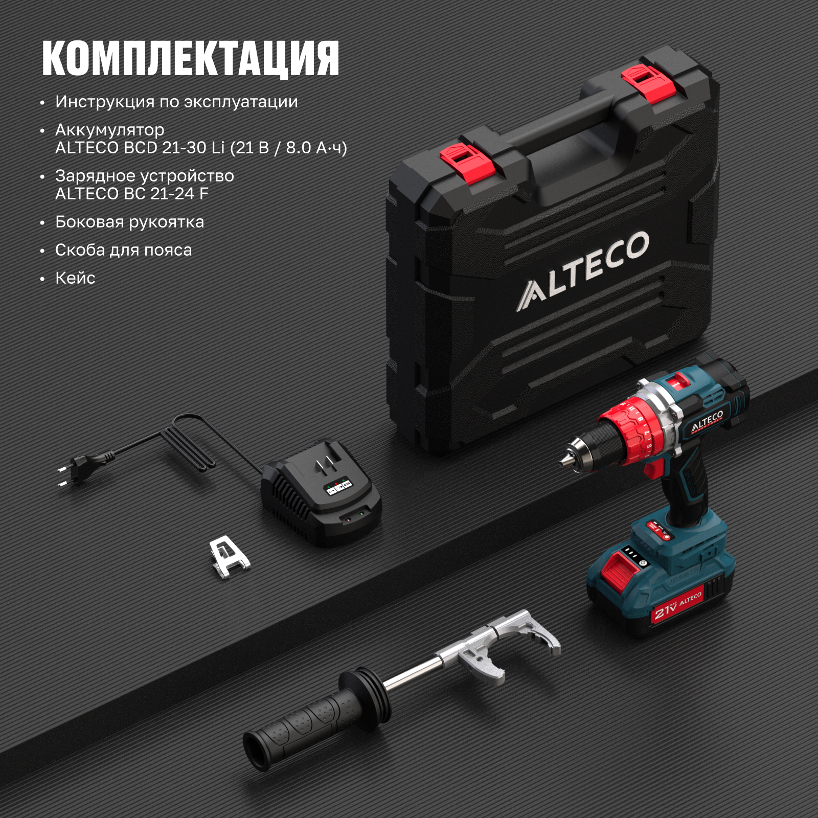 - Аккумулятор ALTECO BCD 21-80 Li (21 В / 8.0 А·ч) × 1 шт