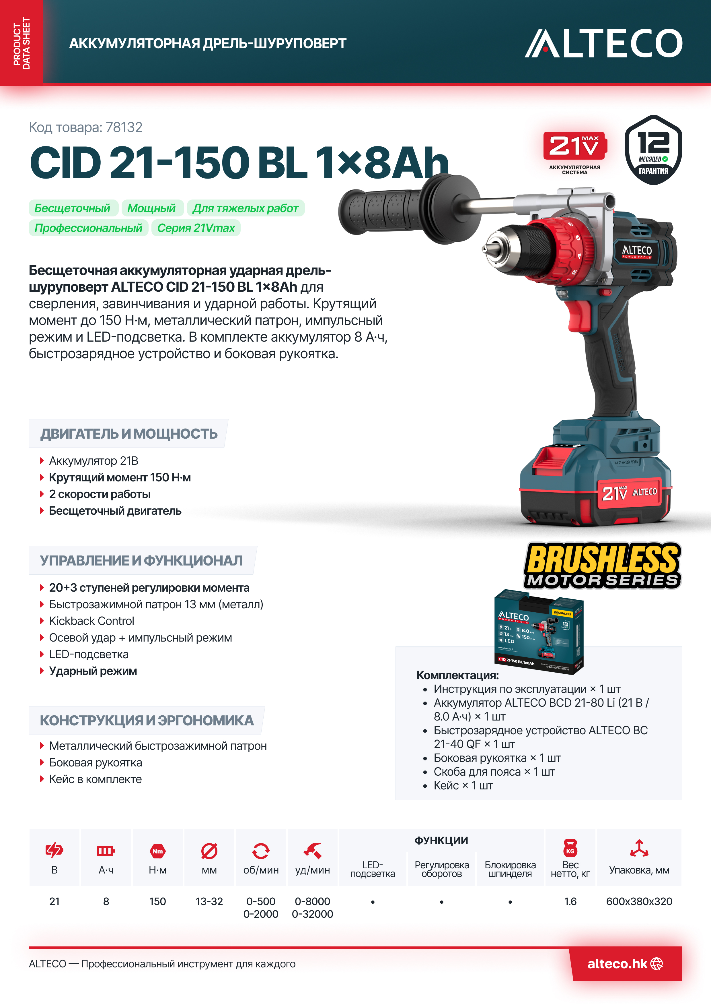 - Часть единой аккумуляторной системы ALTECO 21Vmax — один аккумулятор подходит для всех инструментов этой серии, обеспечивая удобство, экономию и гибкость в работе.