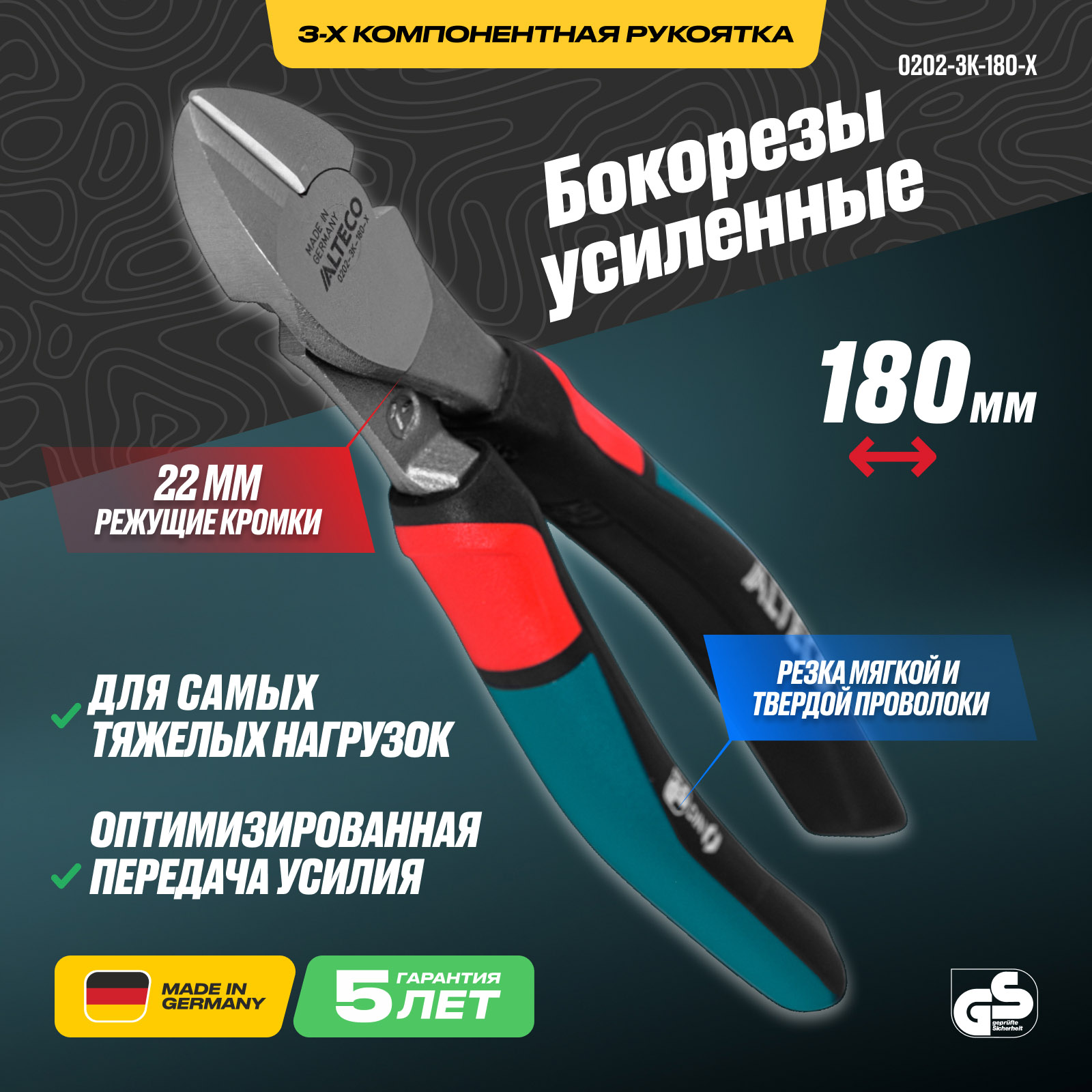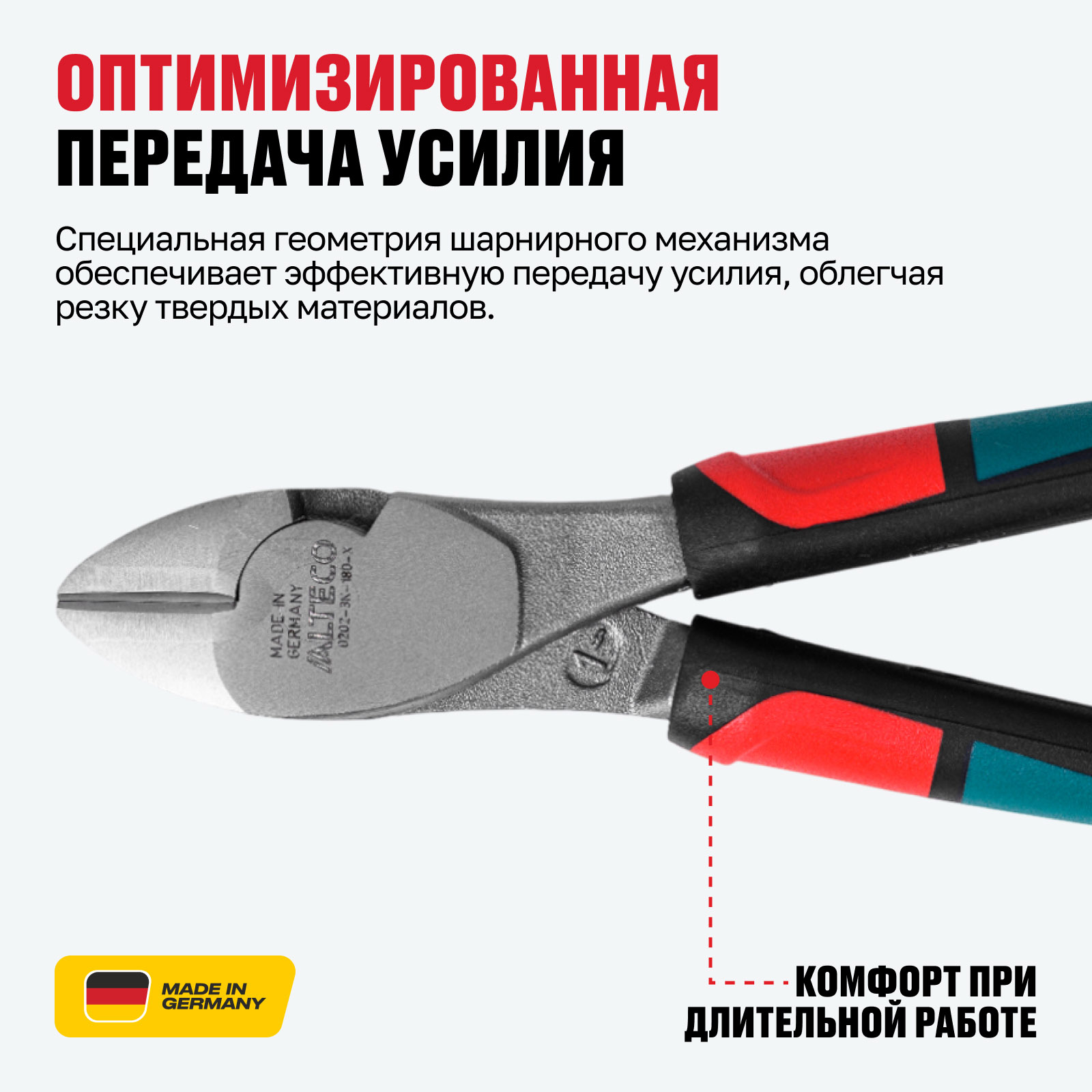 - Усиленный шарнирный механизм — конструкция шарнира снижает требуемое усилие до 30% по сравнению с обычными бокорезами, повышая производительность и снижая нагрузку на руки.