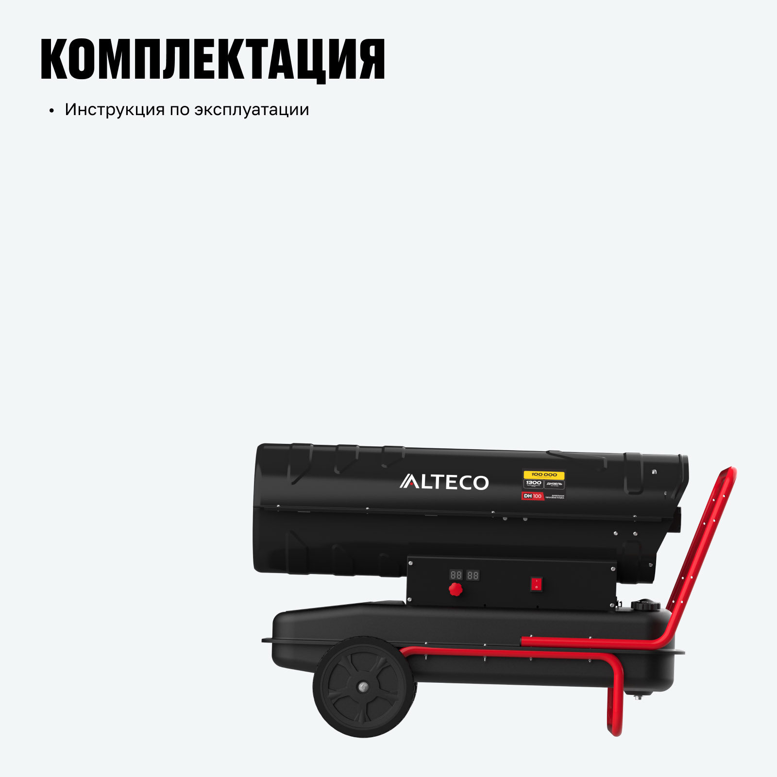- Высокая мощность обогрева 100 кВт — обеспечивает быстрый прогрев воздуха и стабильную температуру на площади до 3600 м³ при производительности 1300 м³/ч.