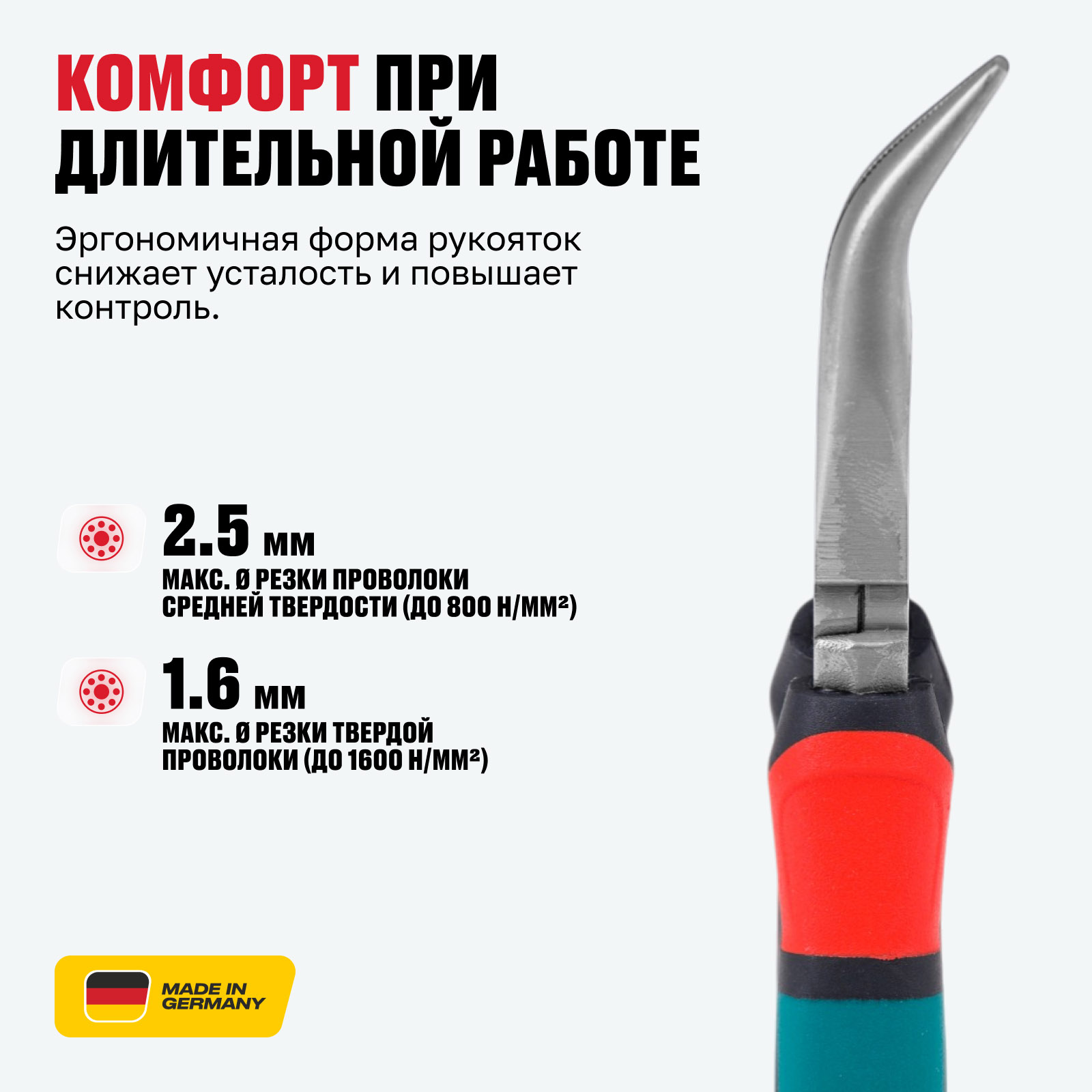 - Изогнутые на 45° длинные губки — полукруглый профиль обеспечивает удобный доступ к деталям и точный контроль при работе с мелкими элементами, особенно в труднодоступных местах.
