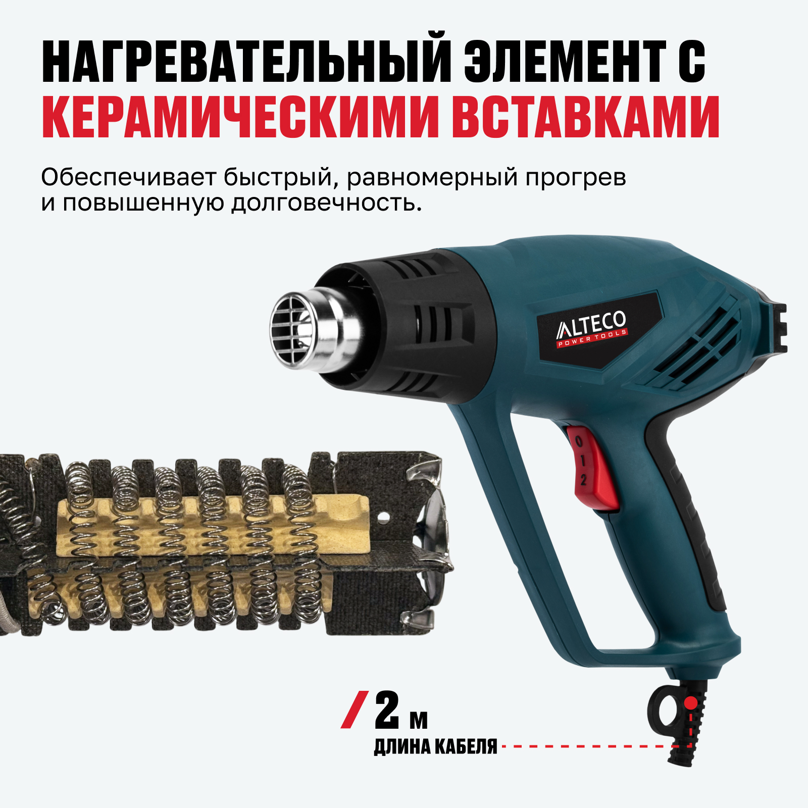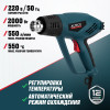 - Высокая мощность 2000 Вт — обеспечивает быстрый нагрев и стабильную подачу горячего воздуха для интенсивных работ.