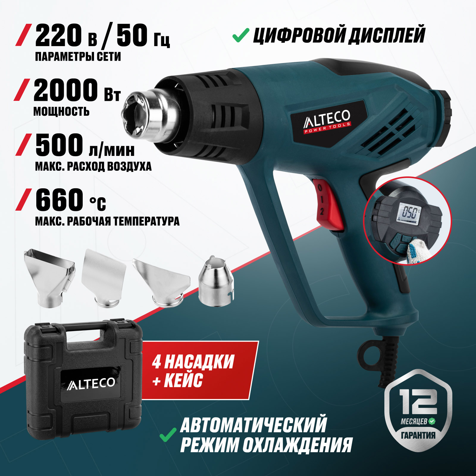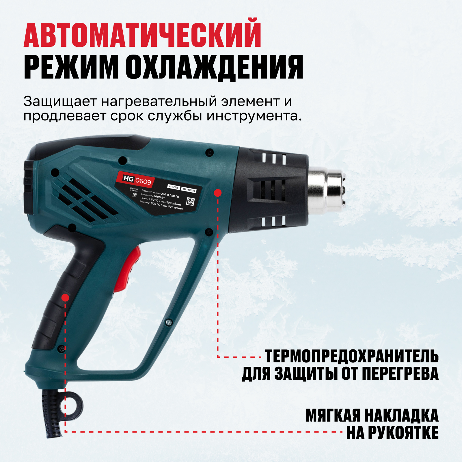 - Автоматический режим охлаждения — защищает нагревательный элемент и продлевает срок службы инструмента.