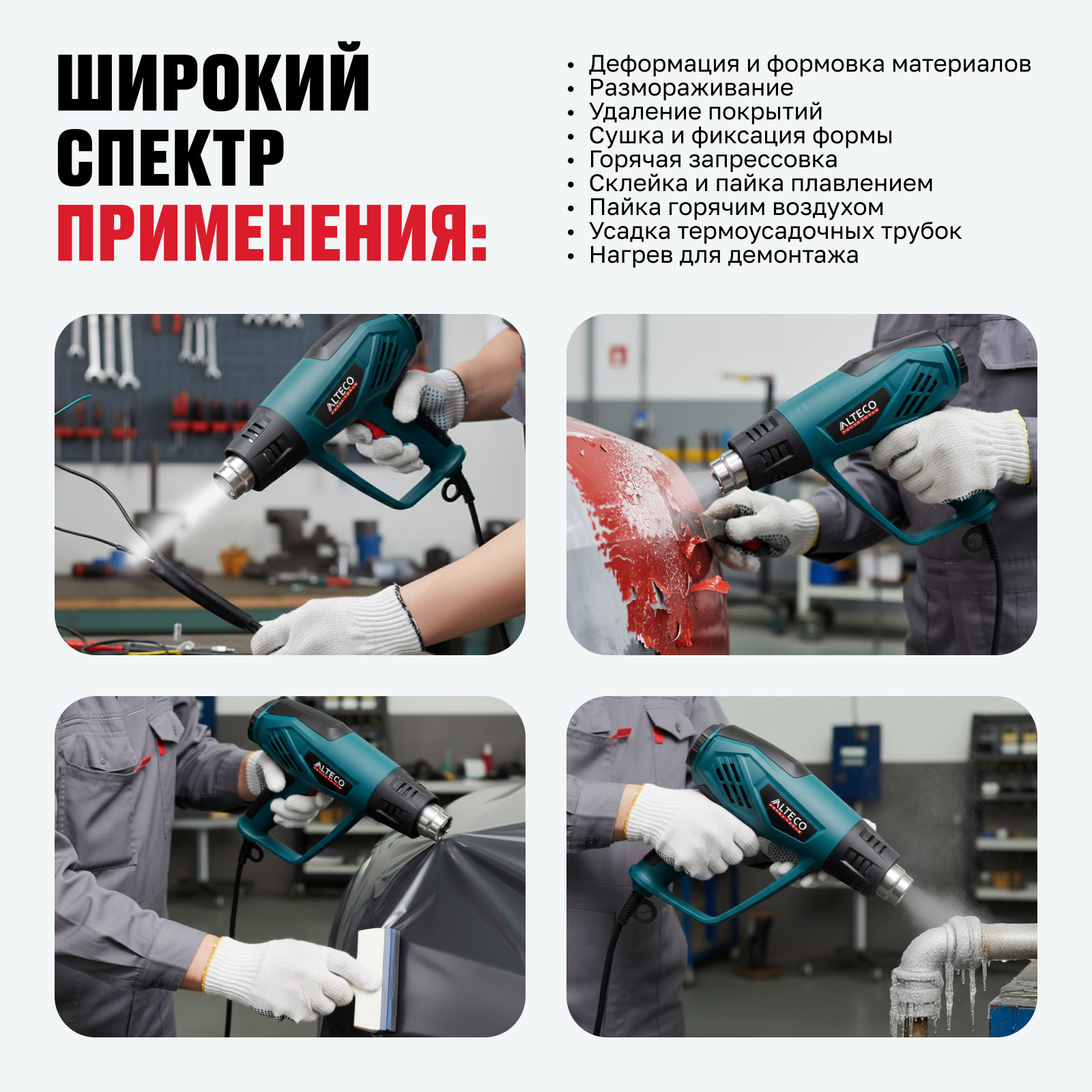 - Удаление покрытий — разогрев краски, пленок и старых лакокрасочных слоев.