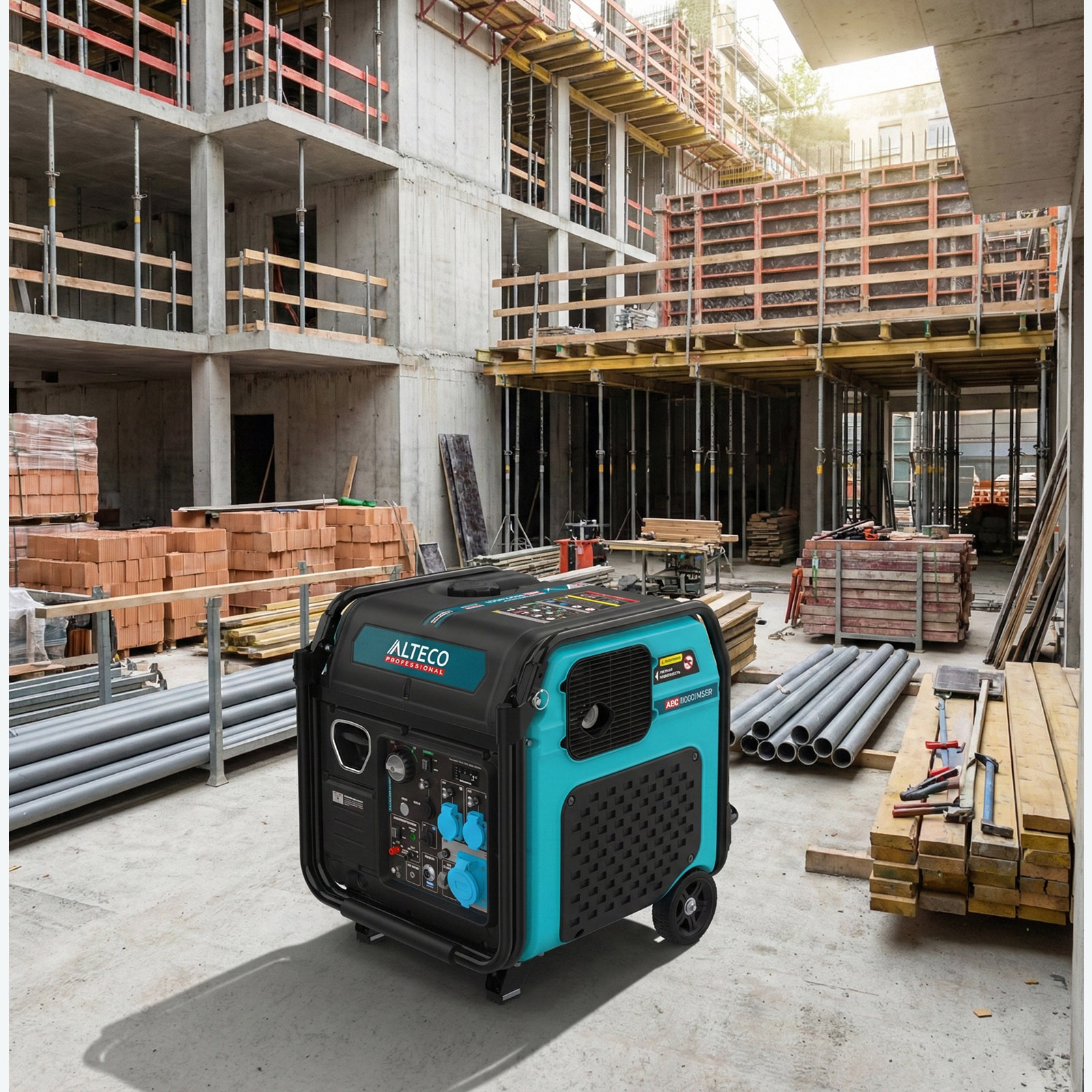 - Транспортные колеса и телескопическая ручка — обеспечивают удобное перемещение генератора без подъема и дополнительных усилий.