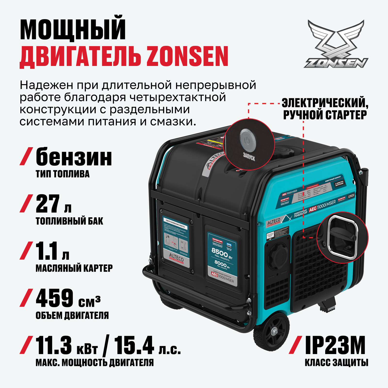 Мощный двигатель Zonsen — надежен при длительной непрерывной работе благодаря четырехтактной конструкции с раздельными системами питания и смазки.