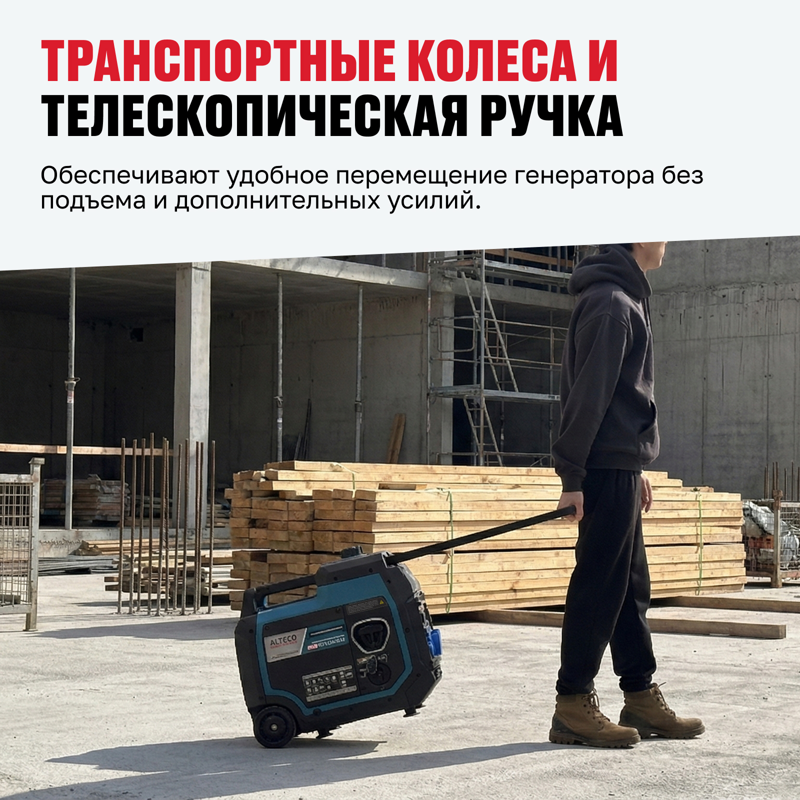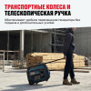 - Транспортные колеса и телескопическая ручка — обеспечивают удобное перемещение генератора без подъема и дополнительных усилий.