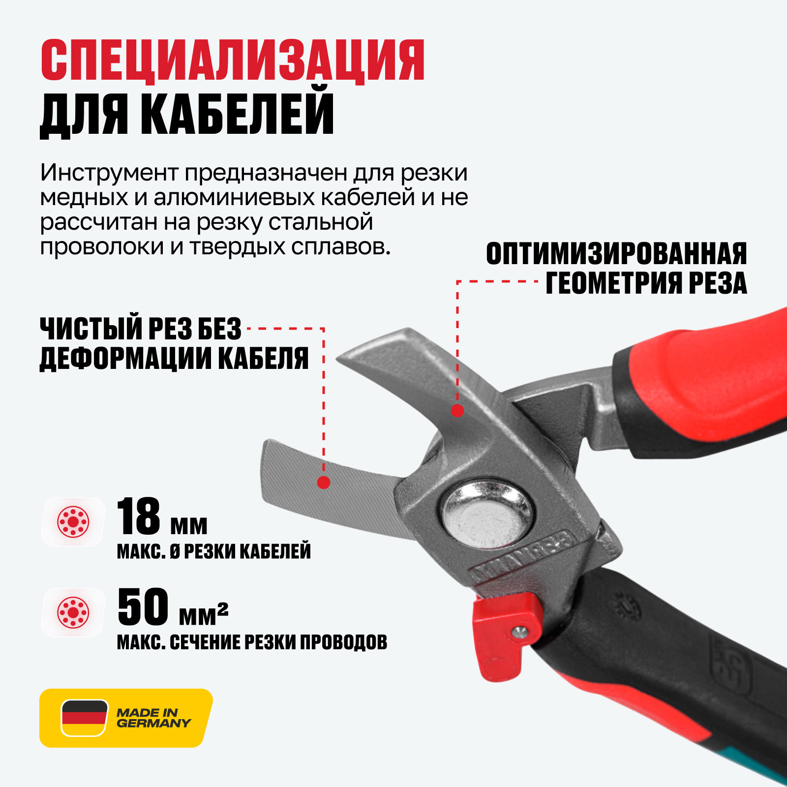 - Специализация для кабелей — инструмент предназначен для резки медных и алюминиевых кабелей и не рассчитан на резку стальной проволоки и твердых сплавов.