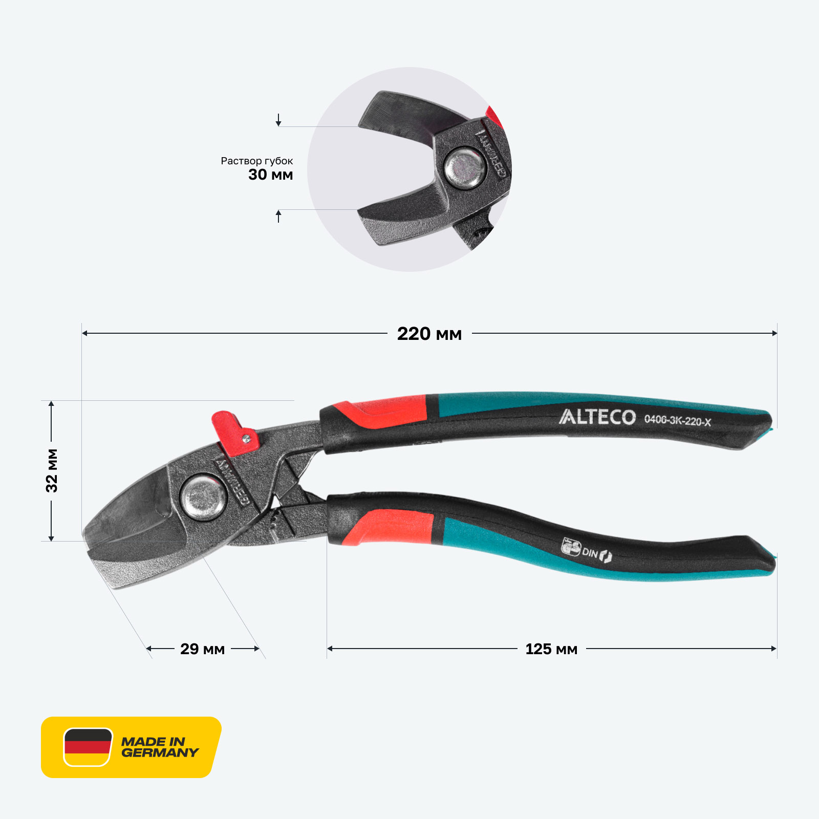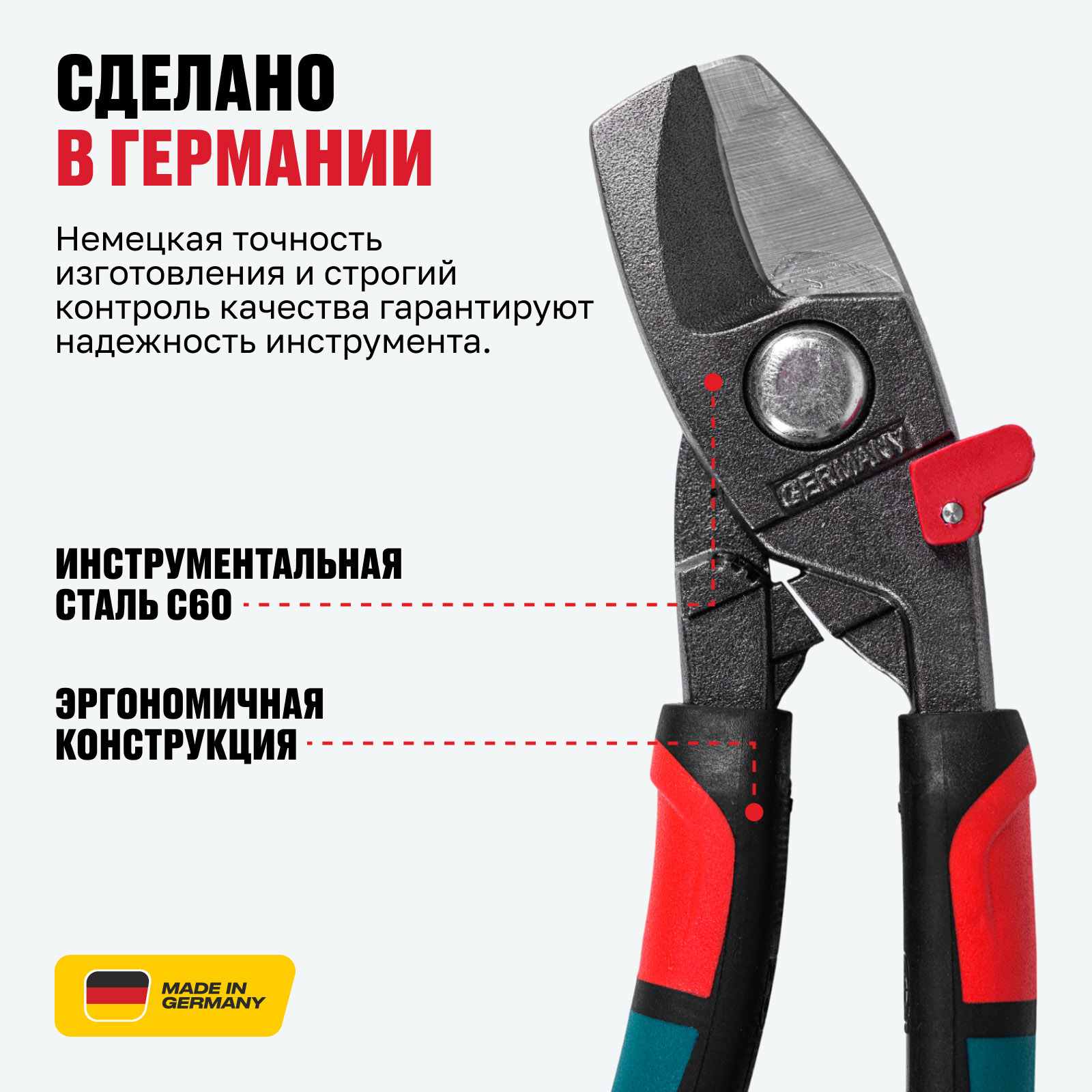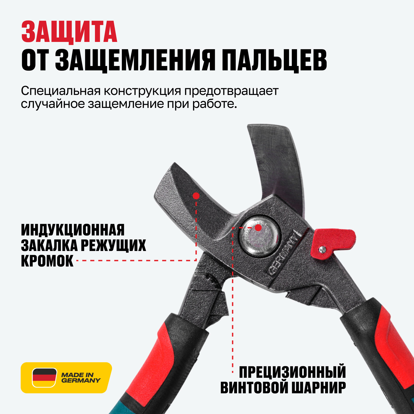 - Чистый рез без деформации кабеля — прецизионные режущие кромки обеспечивают аккуратный срез медных и алюминиевых кабелей без сдавливания и повреждения проводника.