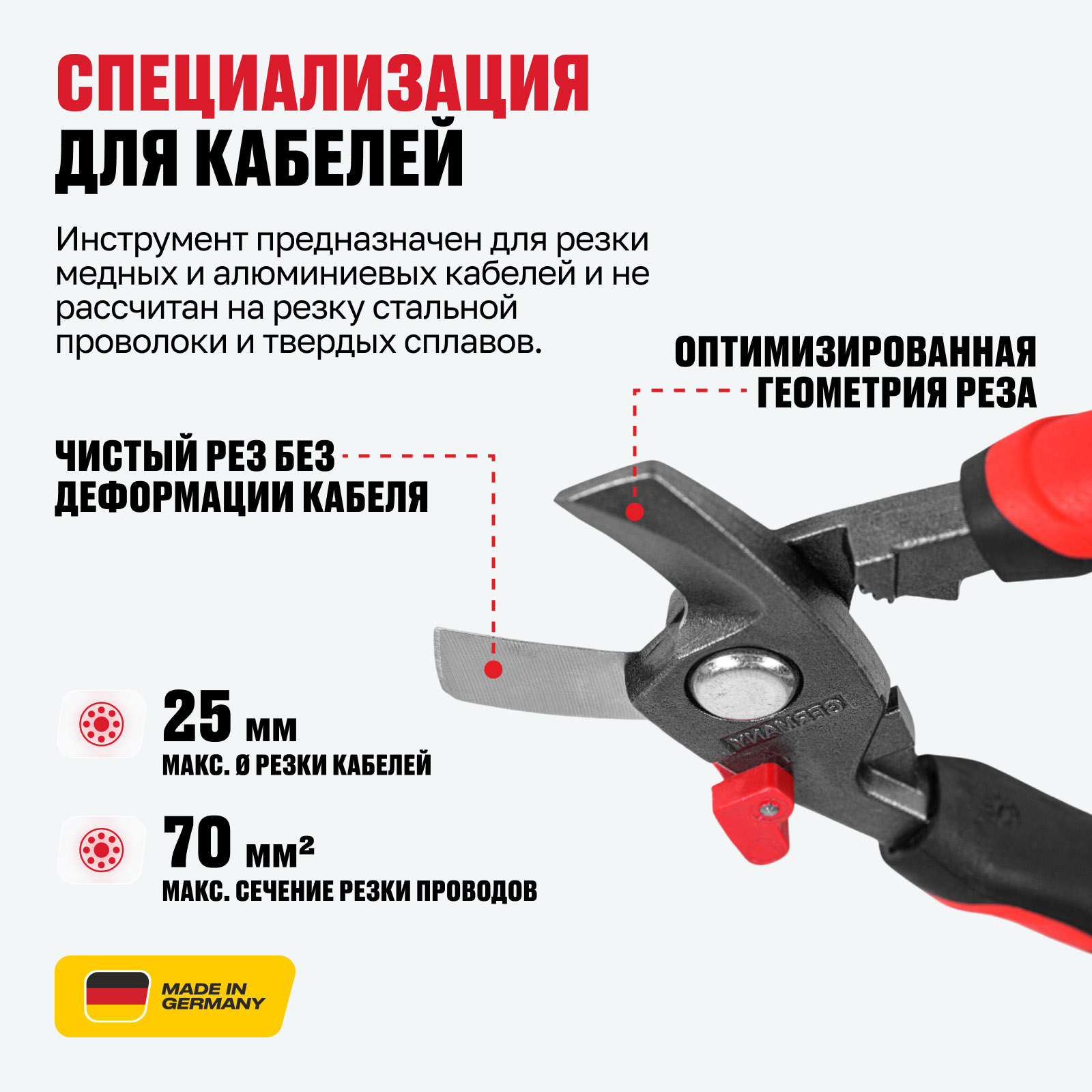 - Специализация для кабелей — инструмент предназначен для резки медных и алюминиевых кабелей и не рассчитан на резку стальной проволоки и твердых сплавов.