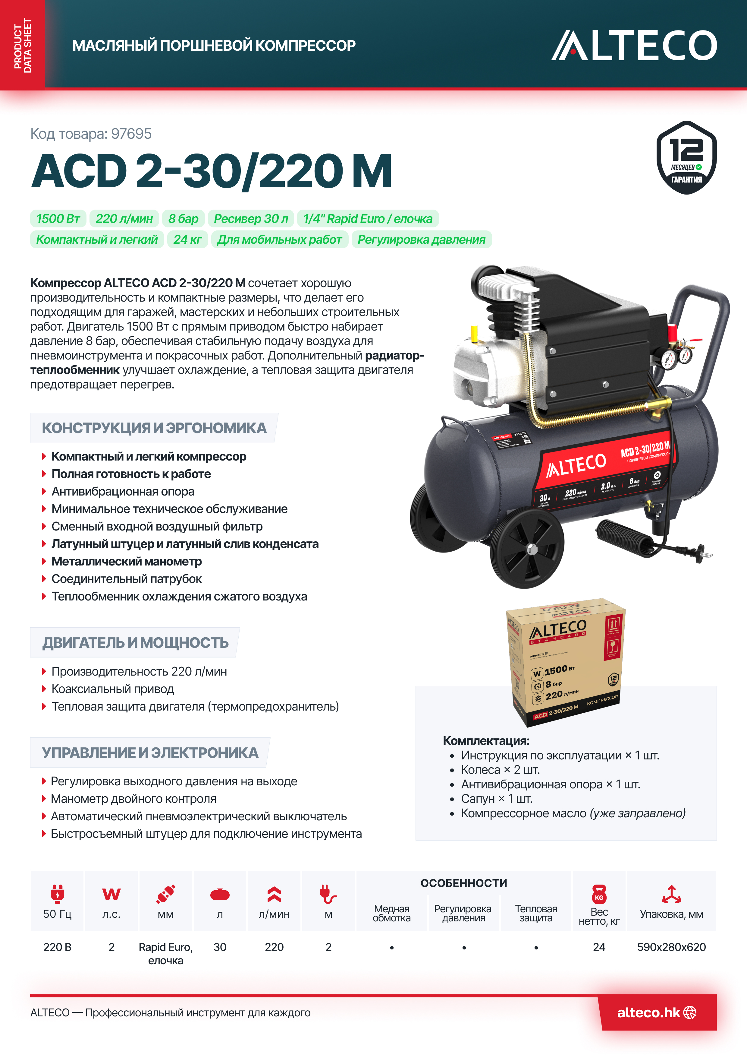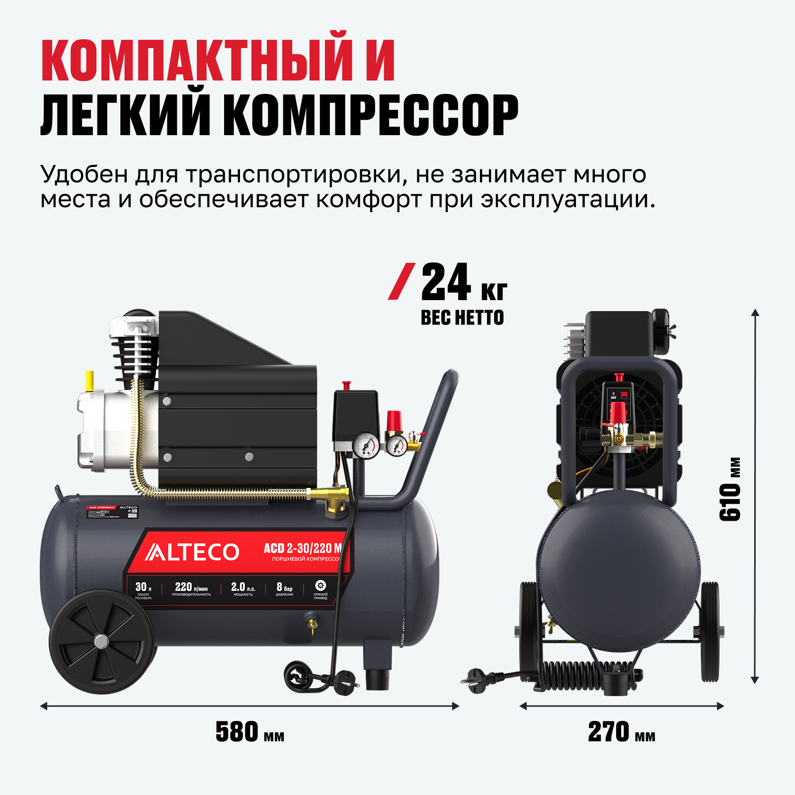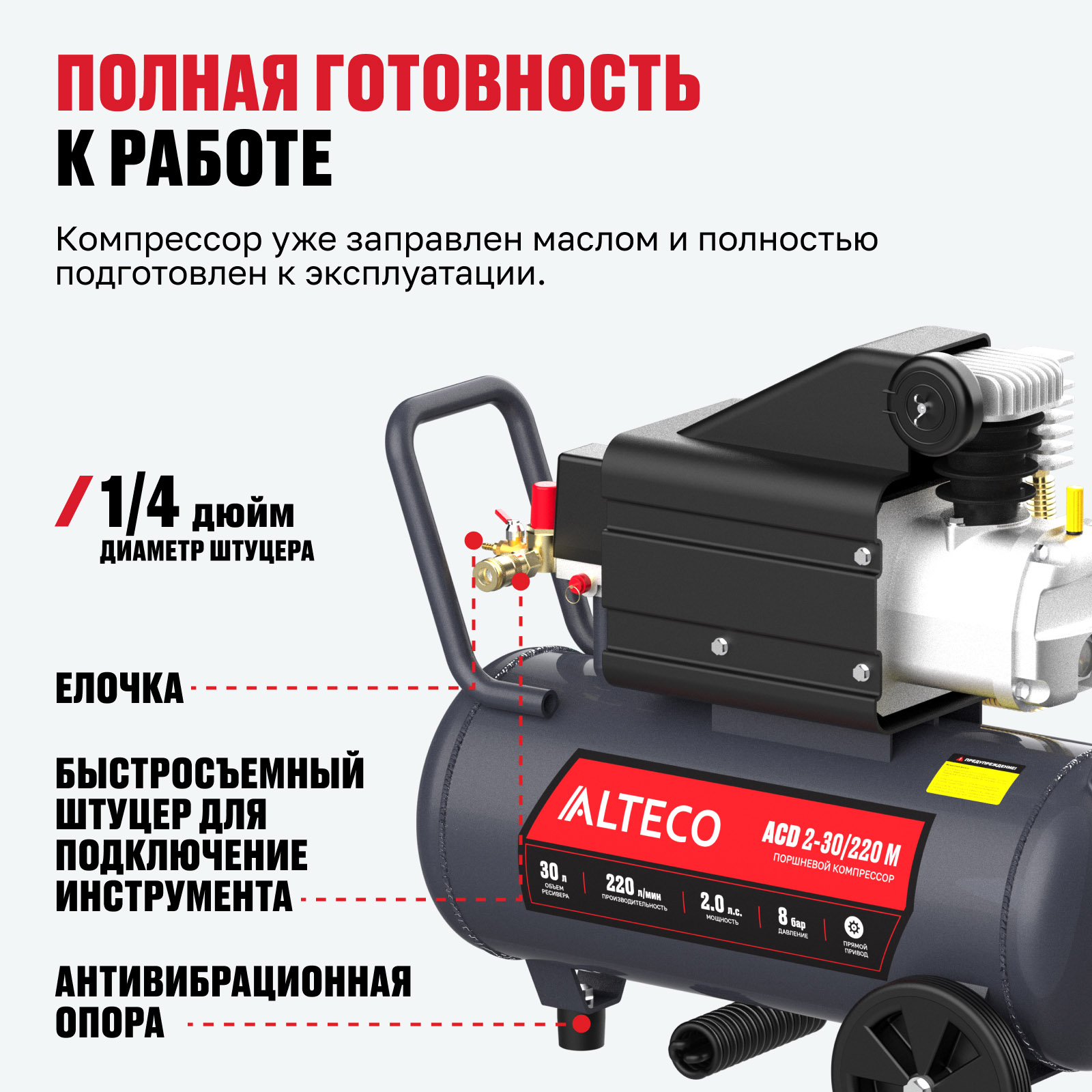 - Полная готовность к работе — компрессор уже заправлен маслом и полностью подготовлен к эксплуатации.