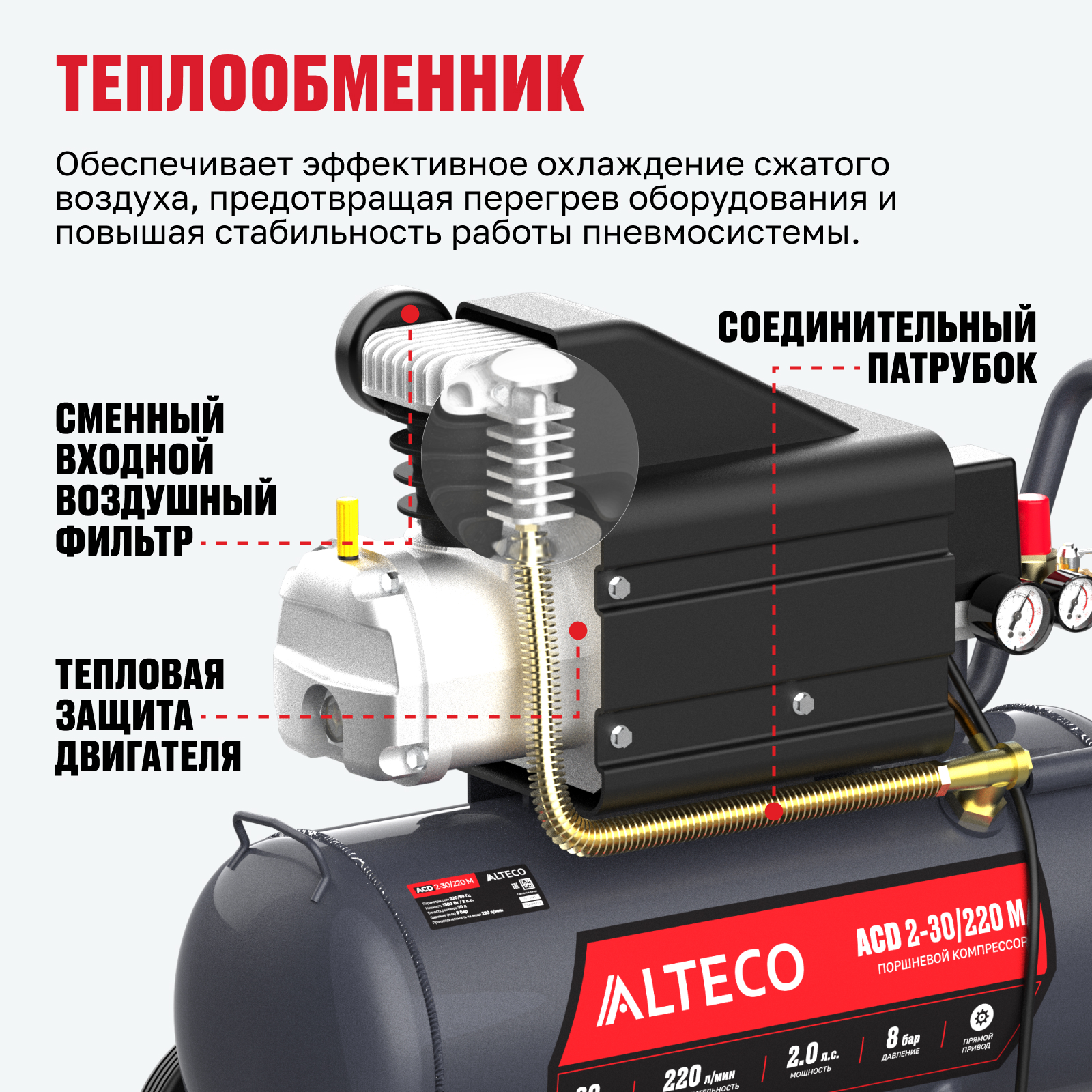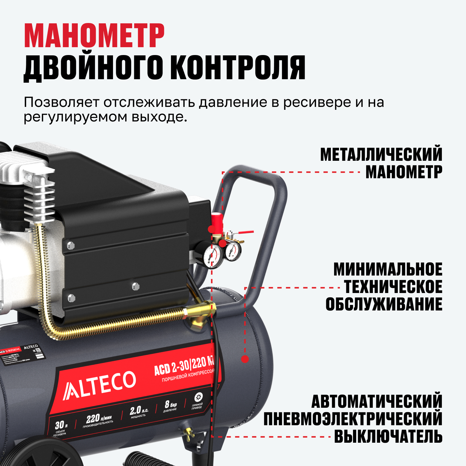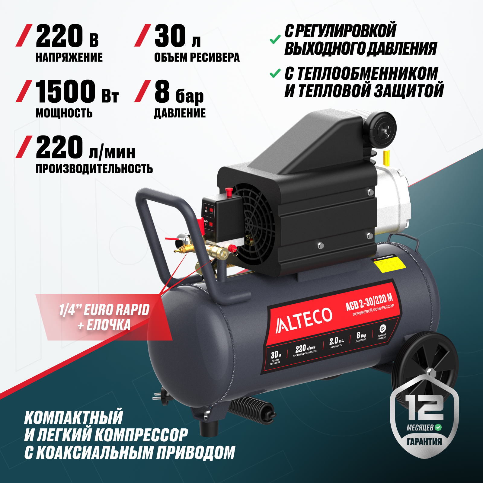 - Полная готовность к работе — компрессор уже заправлен маслом и полностью подготовлен к эксплуатации.