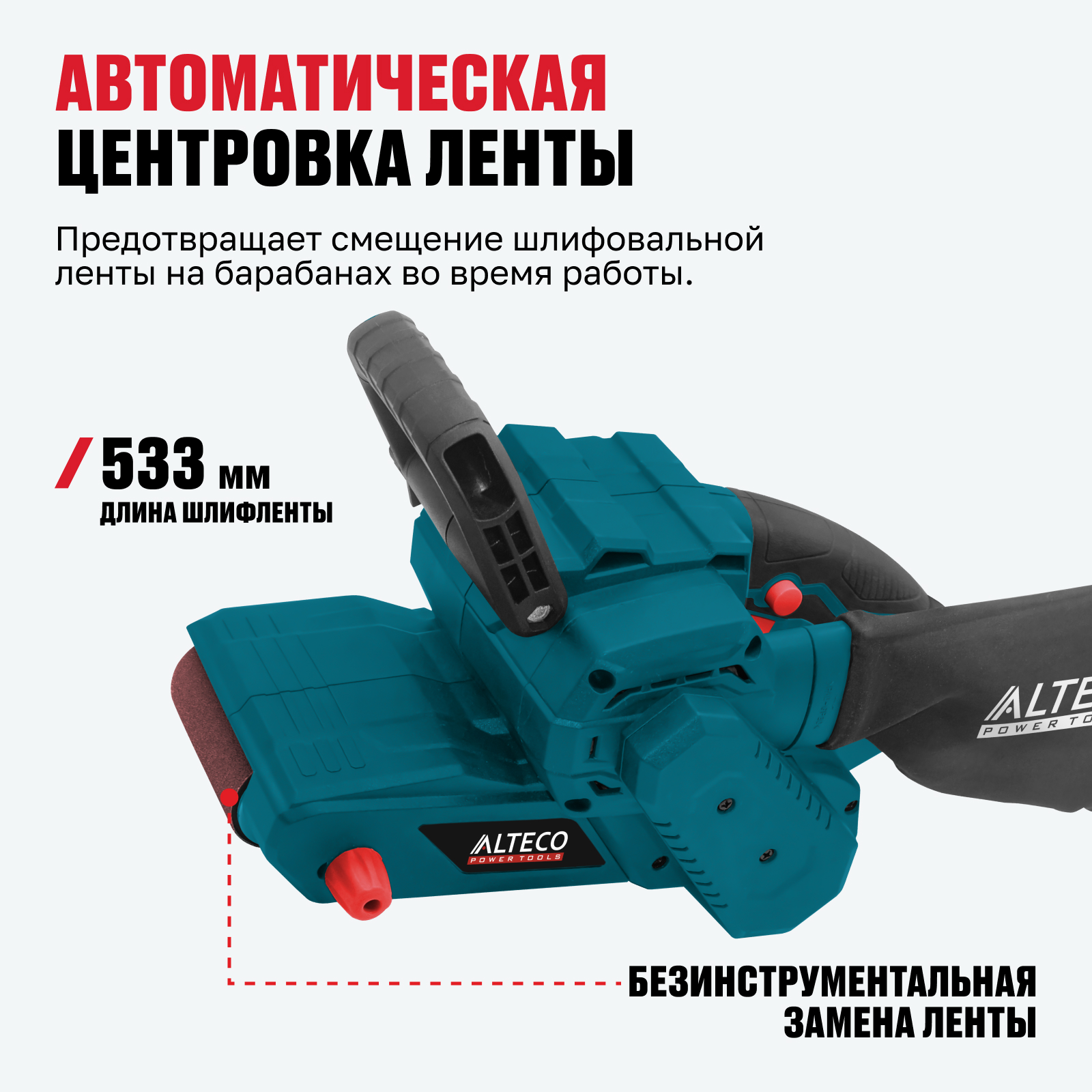 - Автоматическая центровка ленты — предотвращает смещение шлифовальной ленты на барабанах во время работы.