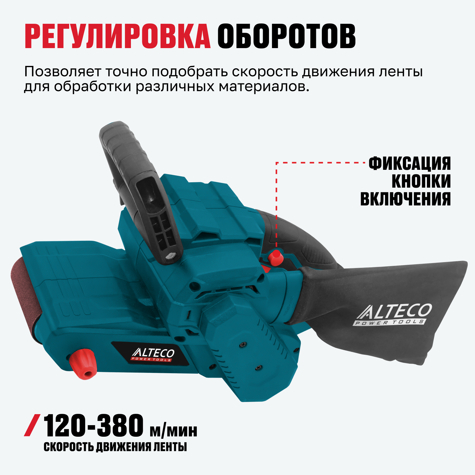 - Регулировка оборотов — позволяет точно подобрать скорость движения ленты для обработки различных материалов.