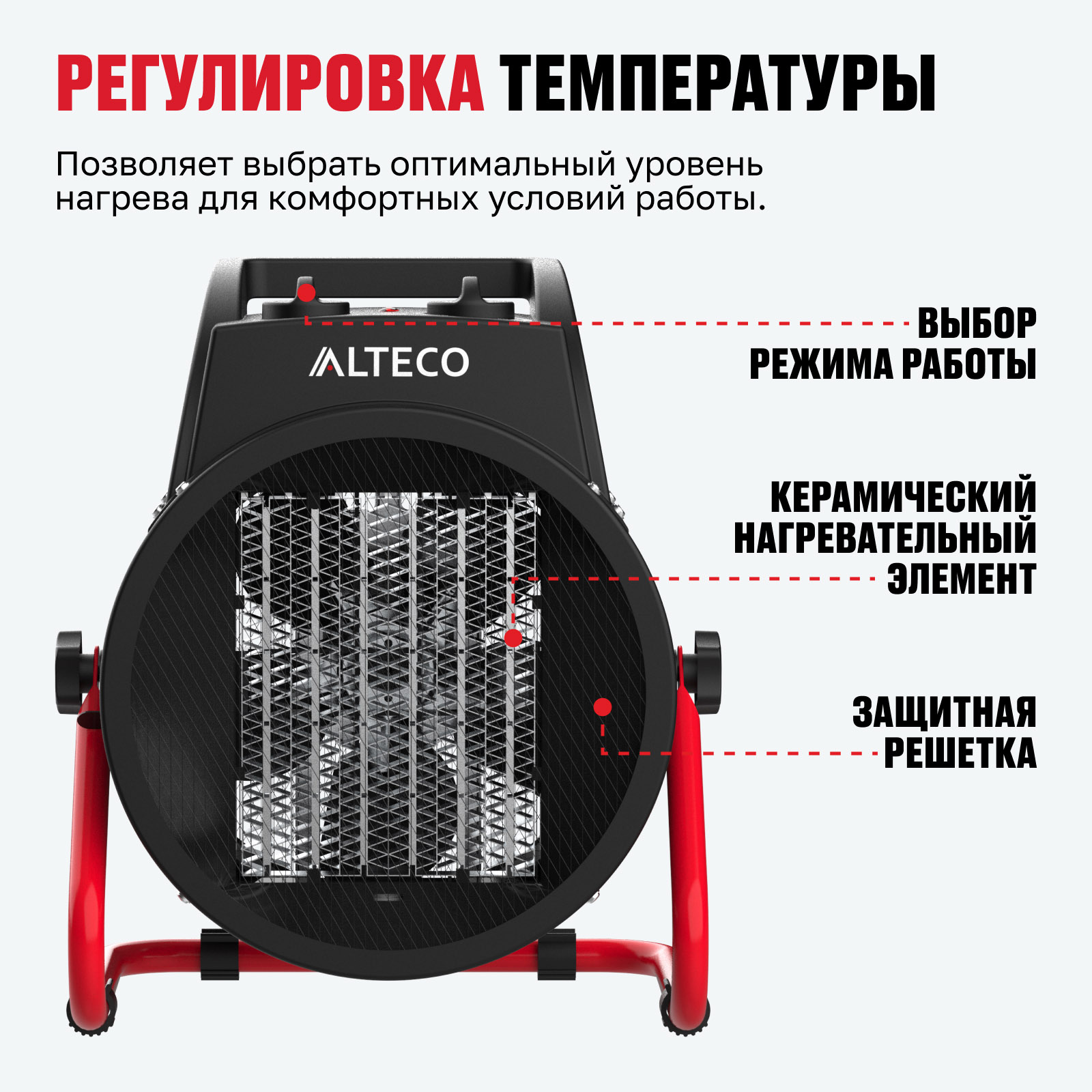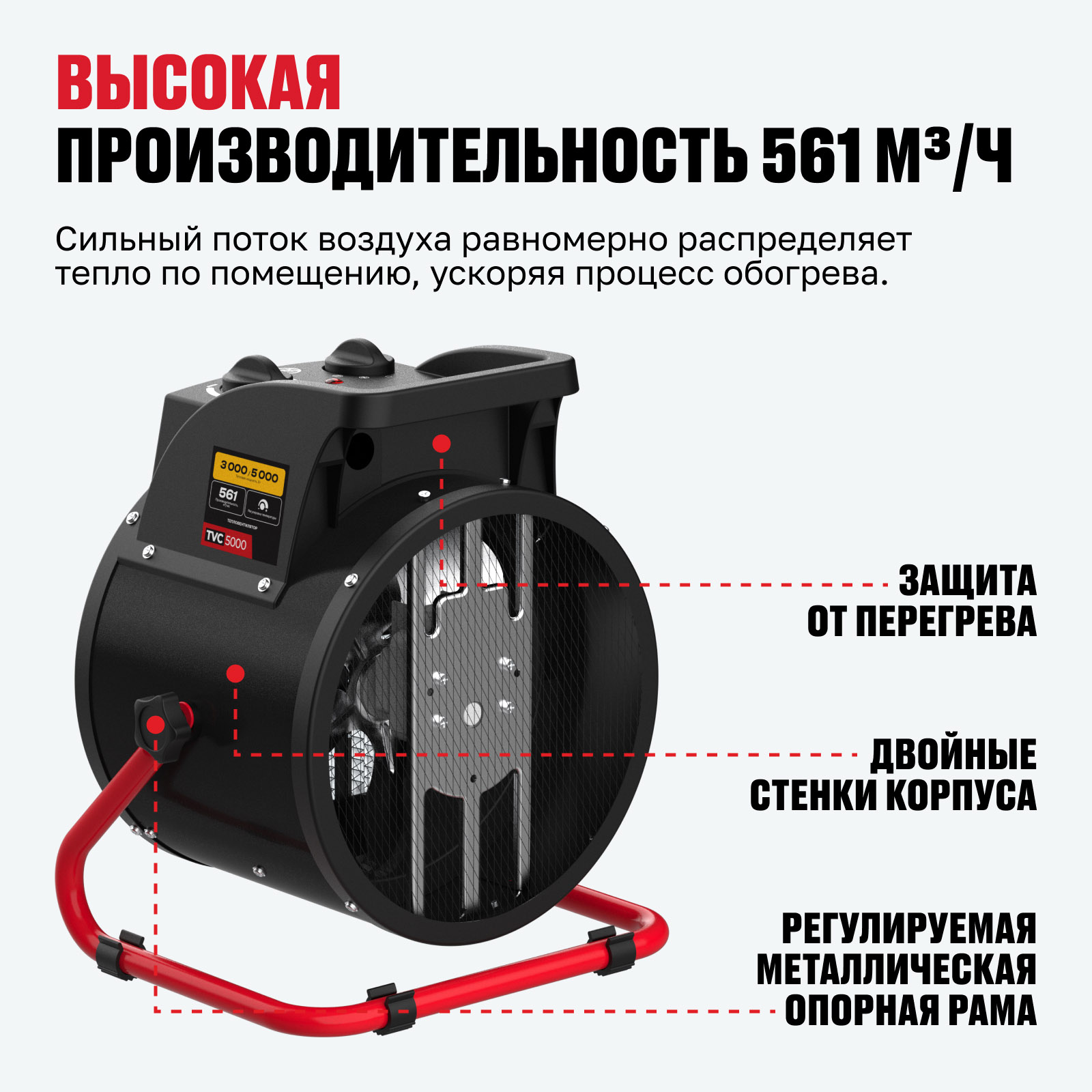 - Мощность обогрева 5000 Вт — обеспечивает быстрый прогрев воздуха и поддерживает комфортную температуру даже при низких температурах.