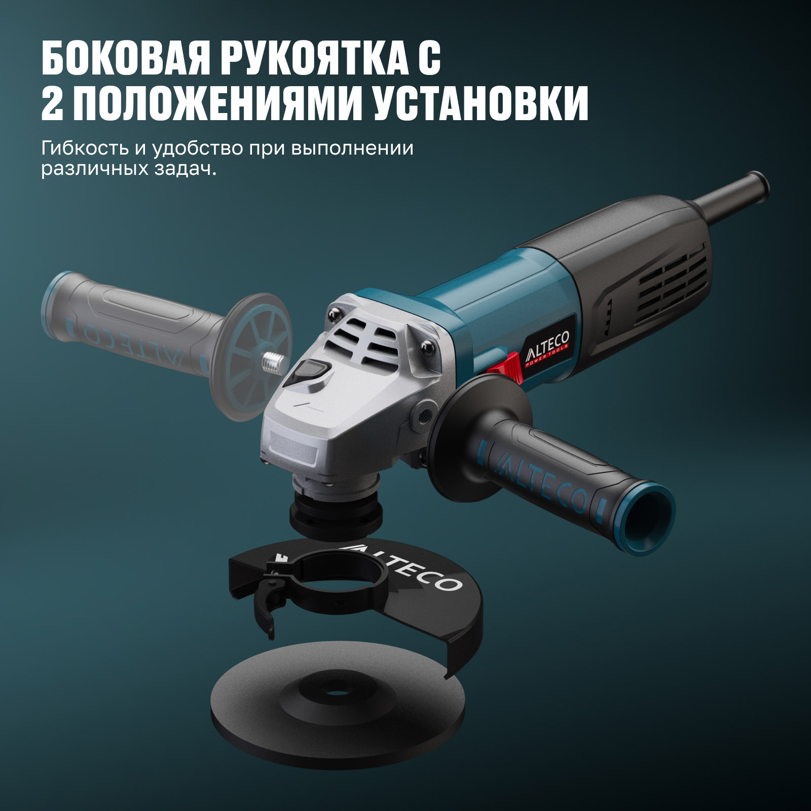 - Боковая рукоятка с 2 положениями установки — гибкость и удобство при выполнении различных задач.