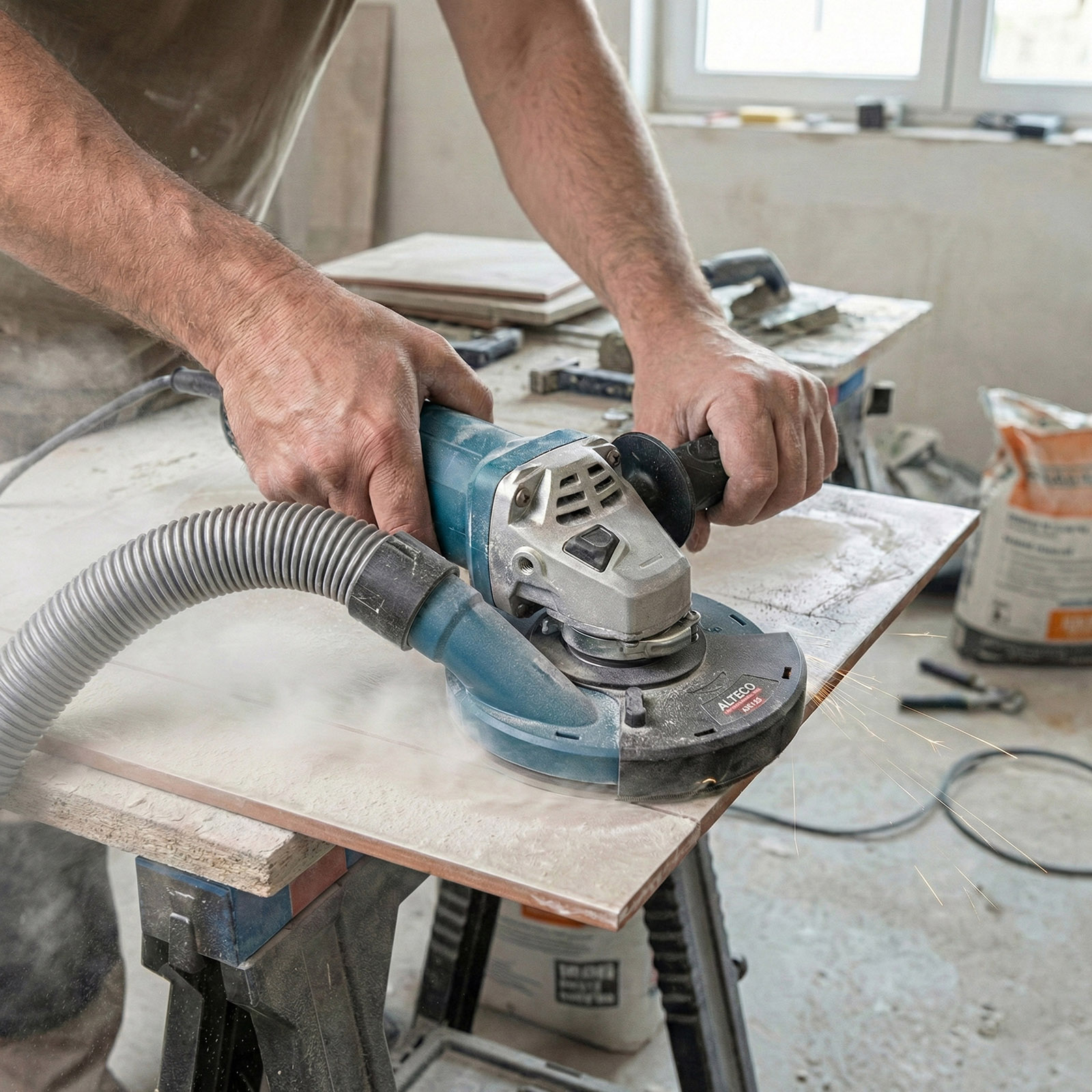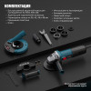 - Быстросъемный защитный кожух 125 мм с адаптером для подключения пылесоса — минимизирует пыль при шлифовке камня и бетона.