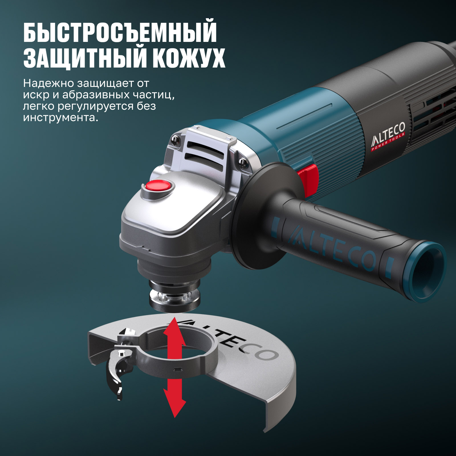 - Быстросъемный защитный кожух — надёжно защищает от искр и абразивных частиц, легко регулируется без инструмента.