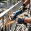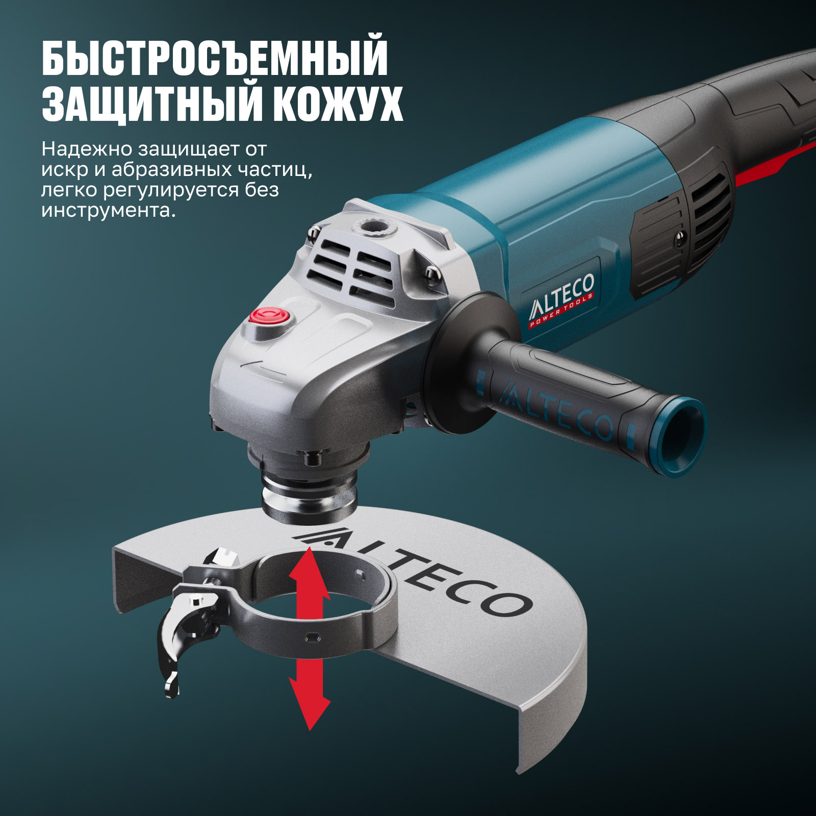 - Быстросъемный защитный кожух — надёжно защищает от искр и абразивных частиц, легко регулируется без инструмента.