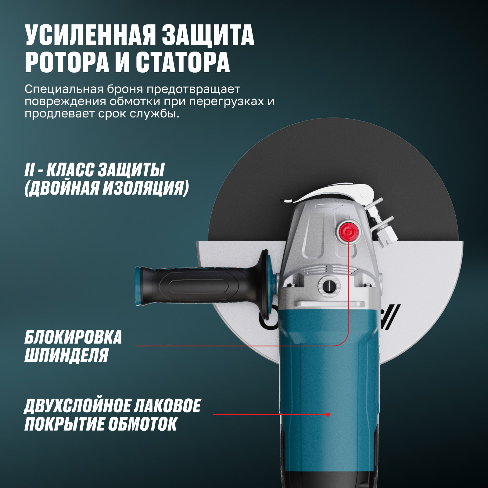 - Усиленная защита ротора и статора — специальная броня предотвращает повреждения обмотки при перегрузках и продлевает срок службы.